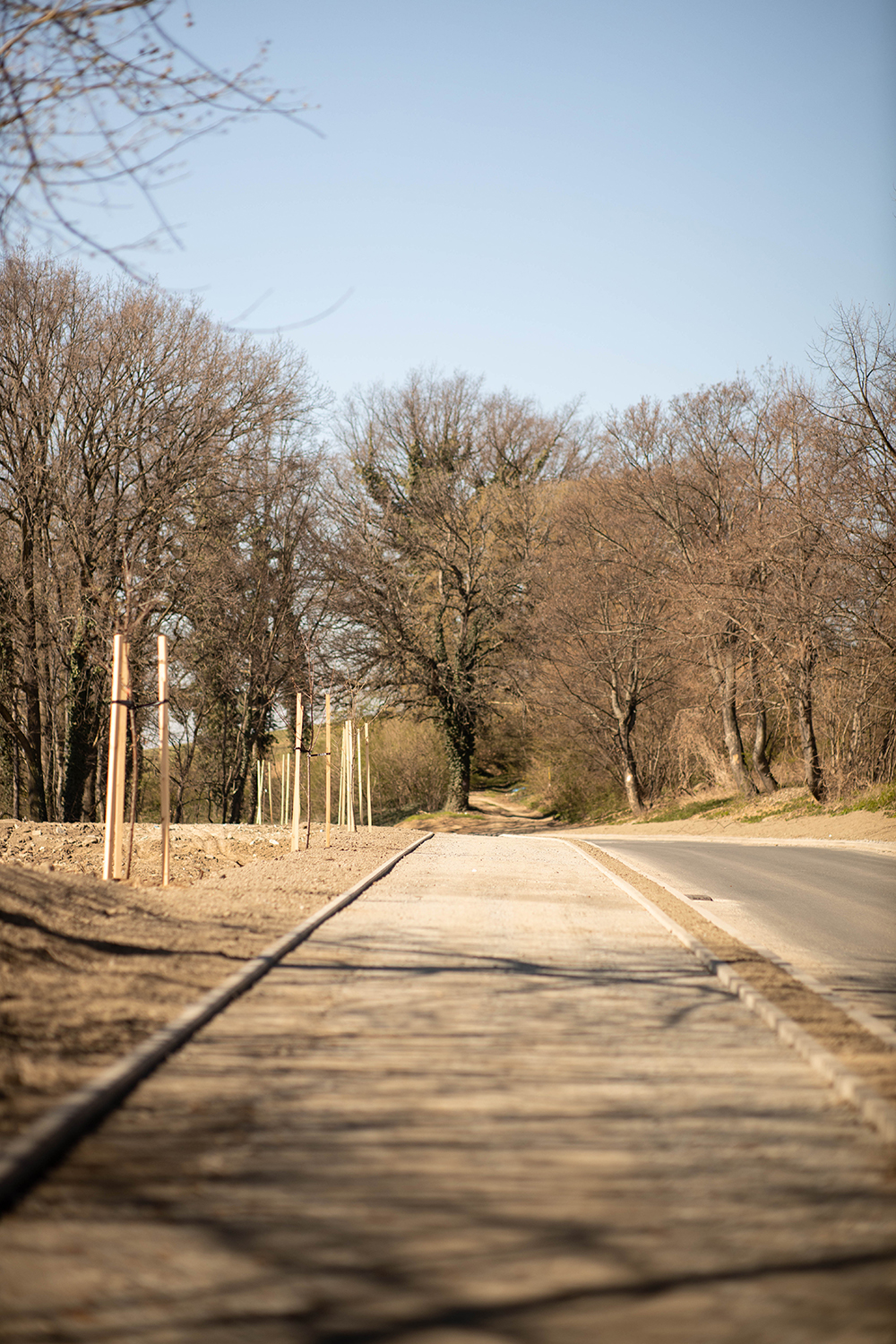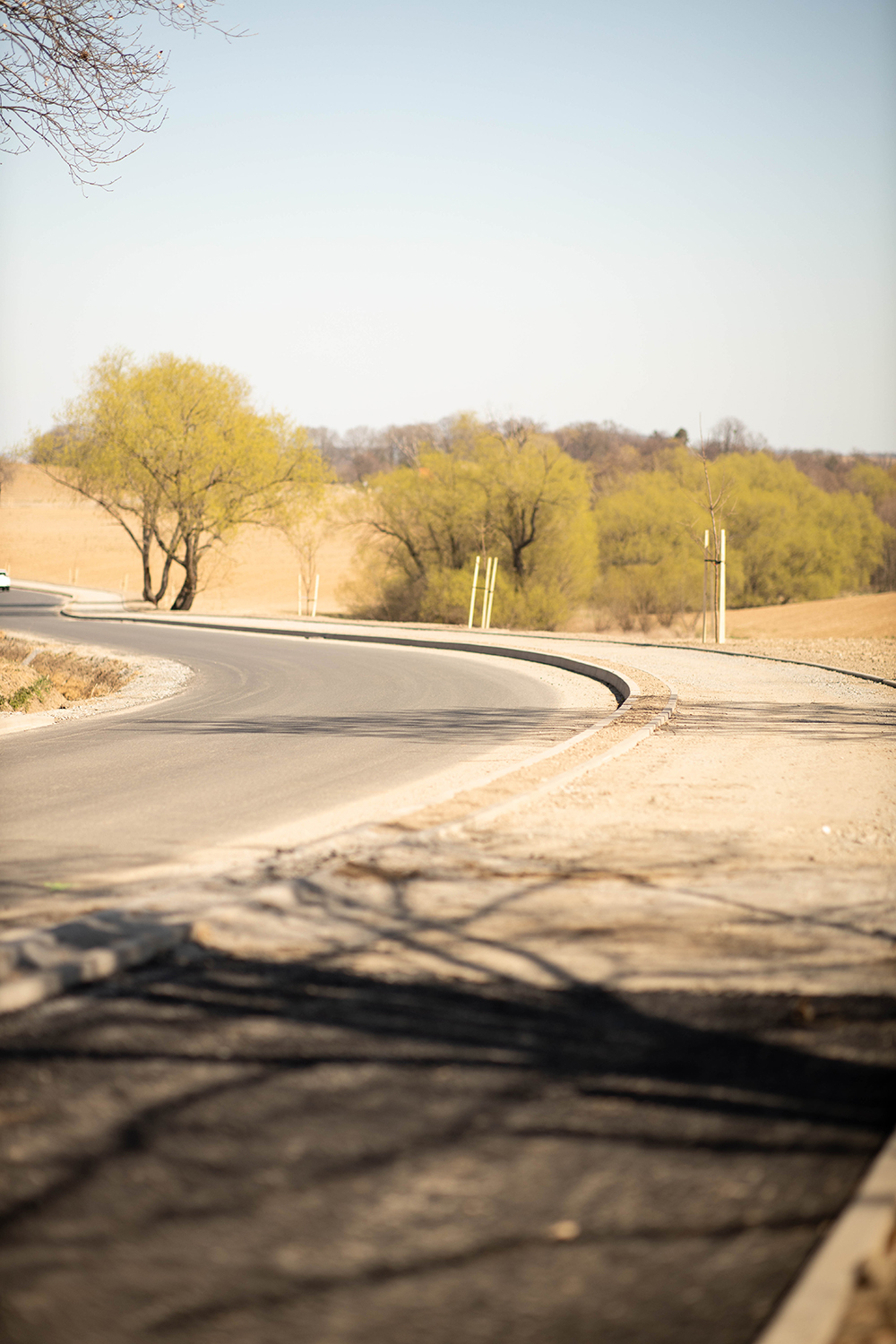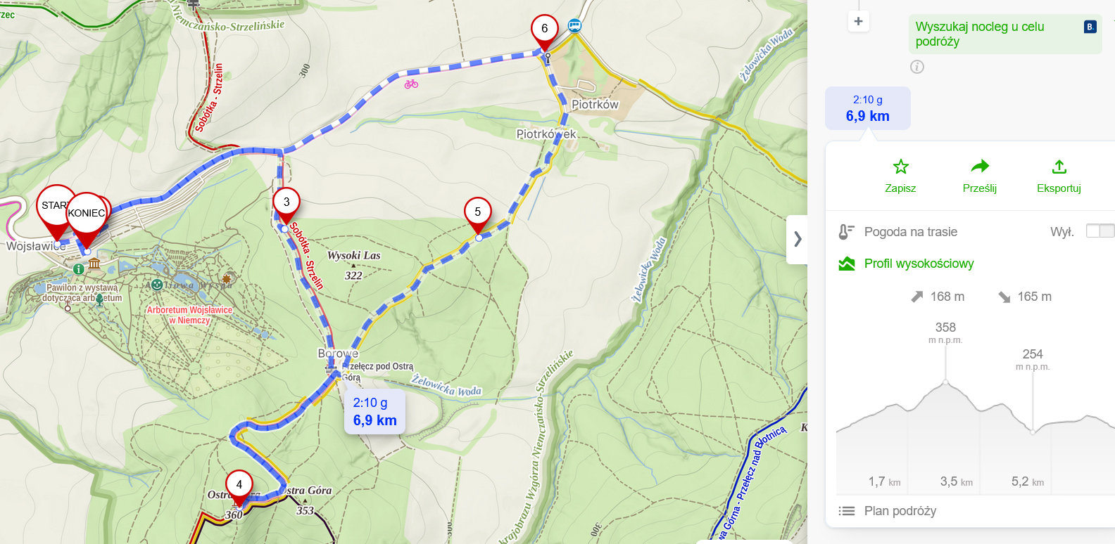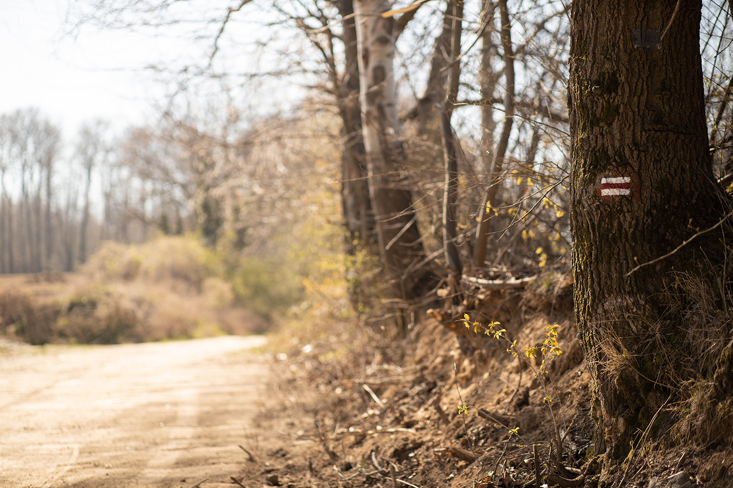 Przechodząc ścieżką wzdłuż Arboretum, mamy na nie widok, szczególnie, że rozciąga się na pagórkowatym terenie. Później wskakujemy na szlak czerwony. Od razu mamy ogląd naszej planowanej drogi powrotnej- chodnik wzdłuż ulicy. To miłe zaskoczenie- widać, że to nowo wybudowana infrastruktura, która przejście wzdłuż ulicy gwarantuje bezpieczne i spokojne.