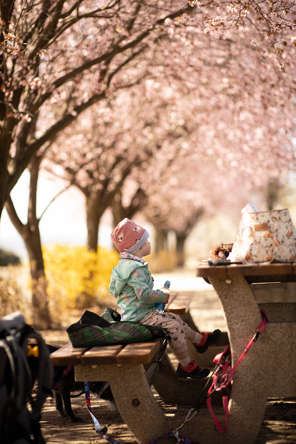 Przy parkingu troszkę zostaniemy. Jest duży. Wiele wskazuje na to, że nawet w sezonie letnim w tygodniu- pustawy- sprawdzone przejeżdżając obok w lipcu 😉 Do tego w części najbliższej wejścia można złapać miejsca zacienione, z ławkami. My byłyśmy tu na przełomie maja i kwietnia i … sceneria parkowania i siedzenia na ławeczkach po spacerze- bajeczna. Kwitnące drzewa tworzą magiczny obraz. Mało która kanapka zgnieciona w plecaku, zjadana przed drogą powrotną smakowała tak baśniowo!