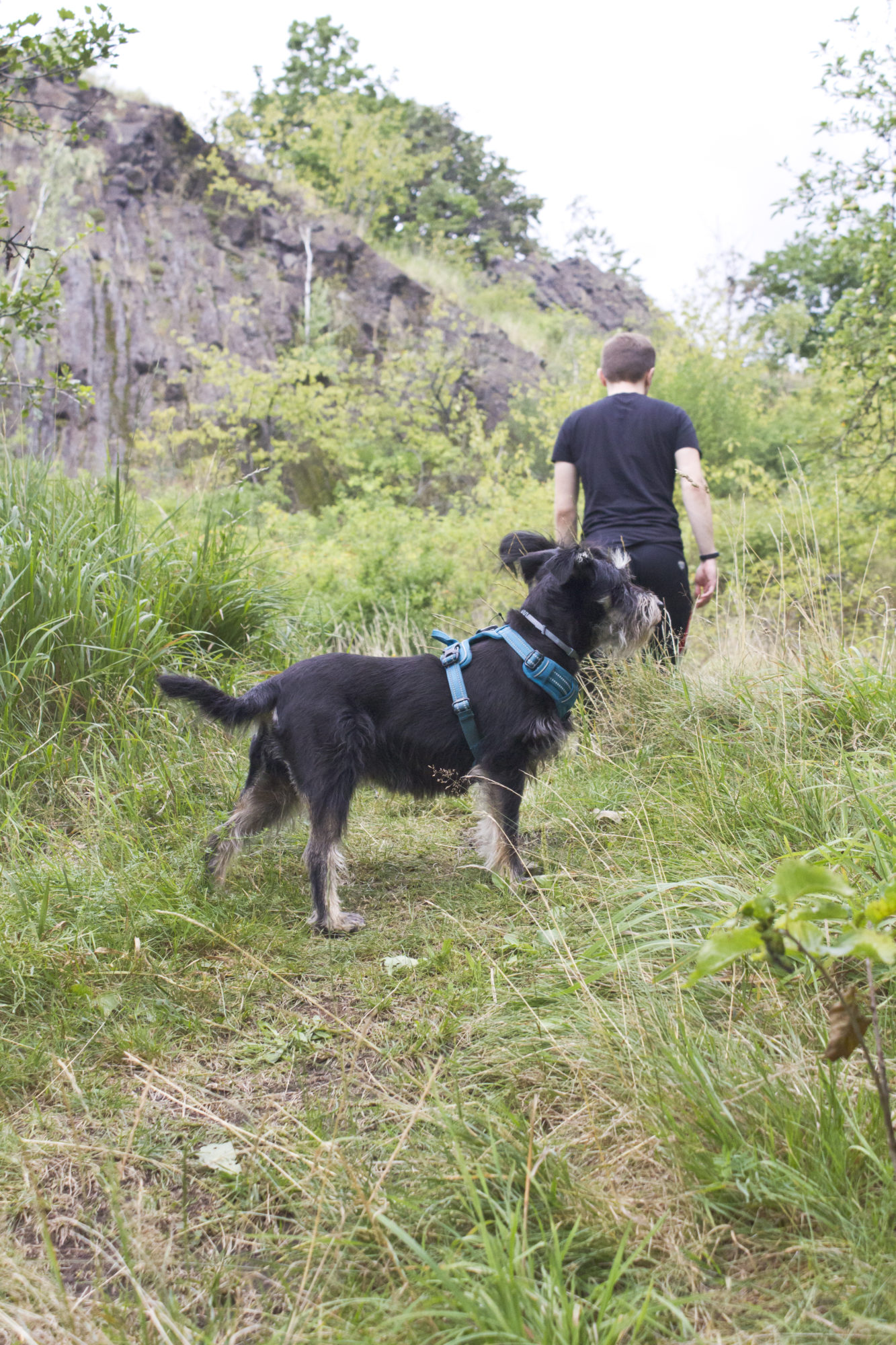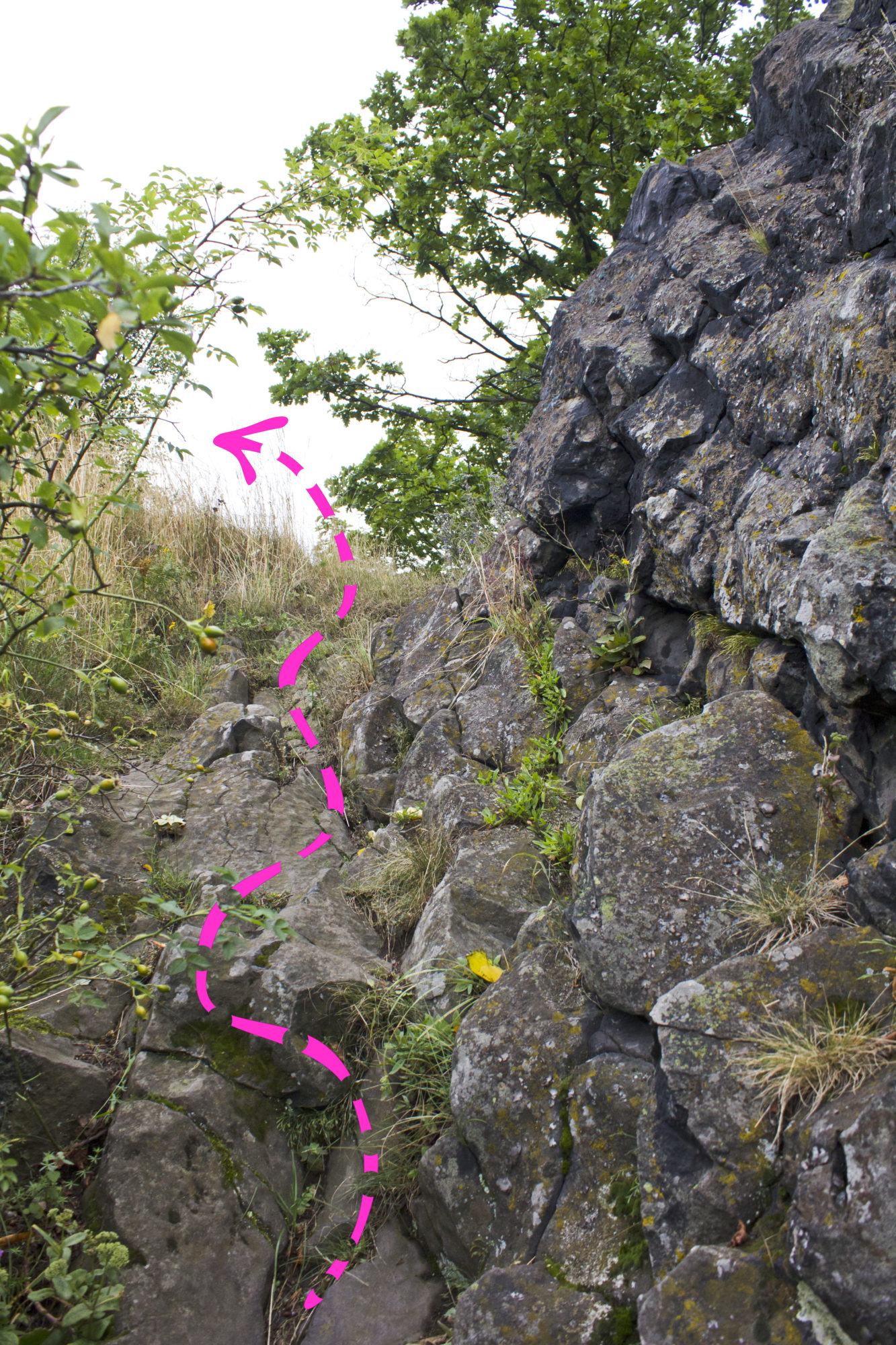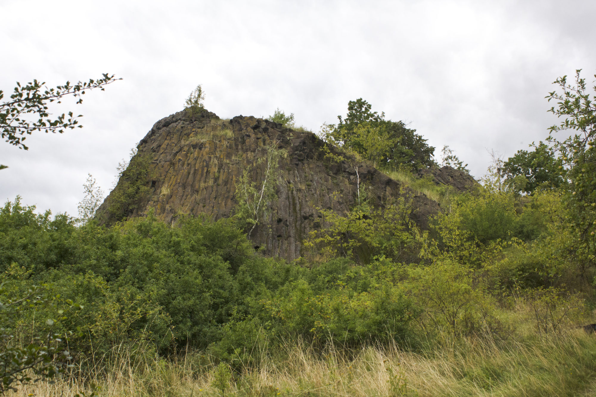 Zaczęliśmy od Czartowskiej Skały, bazaltowej pozostałości po kominie wulkanicznym. Tak, doczytaliśmy przed przyjazdem, bo ja skały rozpoznaję jeszcze gorzej niż drzewa, czyli wiem jak mniej więcej wyglądają te kamulce w pierścionkach, ale już taki sam „dziko żyjący” to dla mnie abstrakcja. Mimo to, pochwalę się – jak już wdrapaliśmy się na Skałę, nie dało się nie zauważyć tych takich pionowych cosiek, które wg wszelkiego tentegowania są właśnie bazaltami 🙂