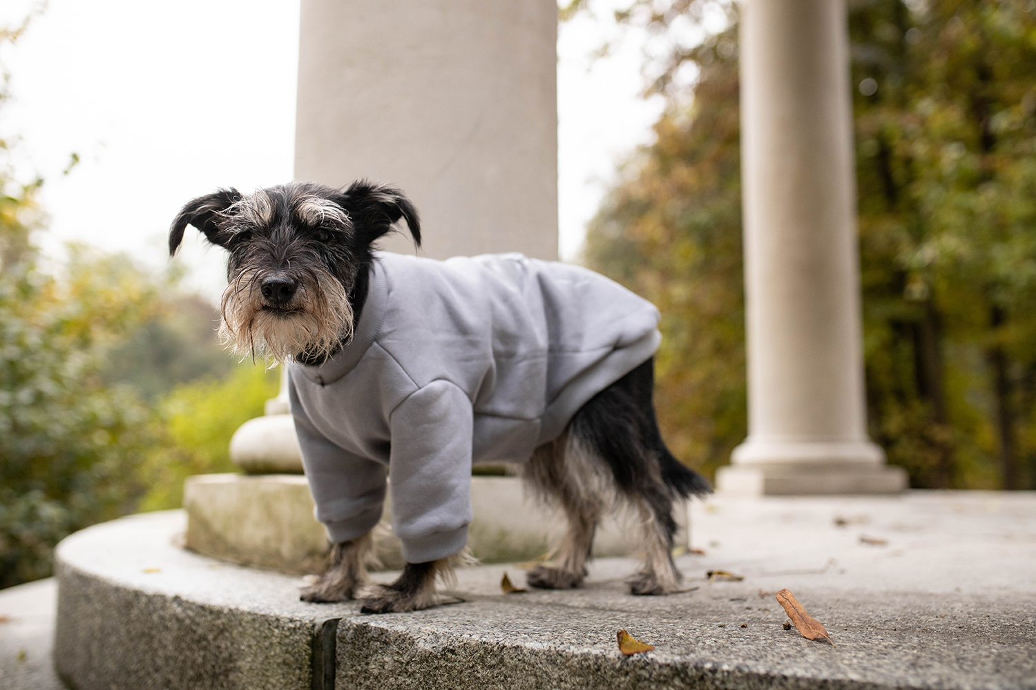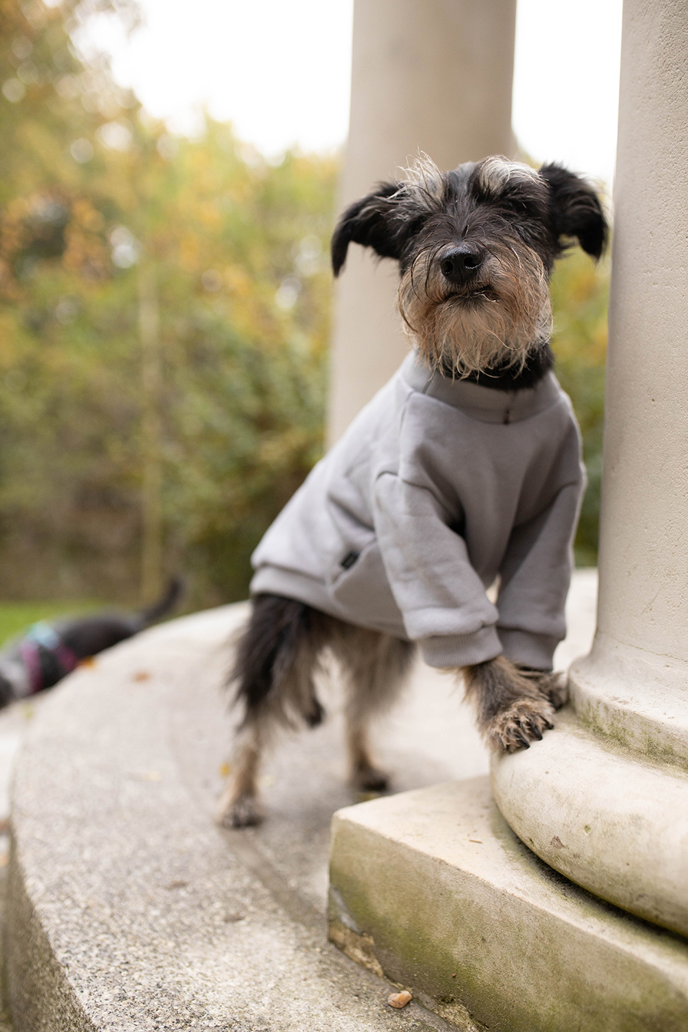 Pieskowa bluza ma lekki golfik i półdługie rękawki. PopPom sugeruje taki właśnie krój bluzy jak na Pufiaczku, jest to według ich informacji fason luźniejszy. Ja sobie dopowiem- casualowy. Ma również taki sam odblaskowy nadruk jak ja – nasze pufoświatowe logo. Opcje nadruku można w pełni personalizować,