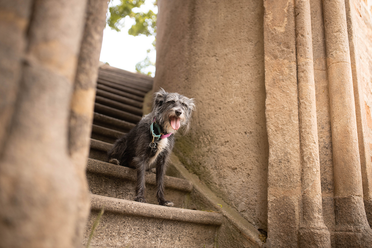 Ten etap zwiedzania miejskiego był dla nas wszystkich najbardziej męczący- schody, przymus bycia na krótkiej smyczce, nawet jak się jest ultra grzecznym pieskiem, wizja konieczności noszenia kagańca i niestety zwiększająca się później ilość ludzi wokoło. Uciekłyśmy więc w dół, bo wiadomo, że są 2 najlepsze kierunki do marszu - z górki i na południe- wtedy tak się człowiek czuje jakby też schodził. Nasze z górki na południe oznaczało azymut na