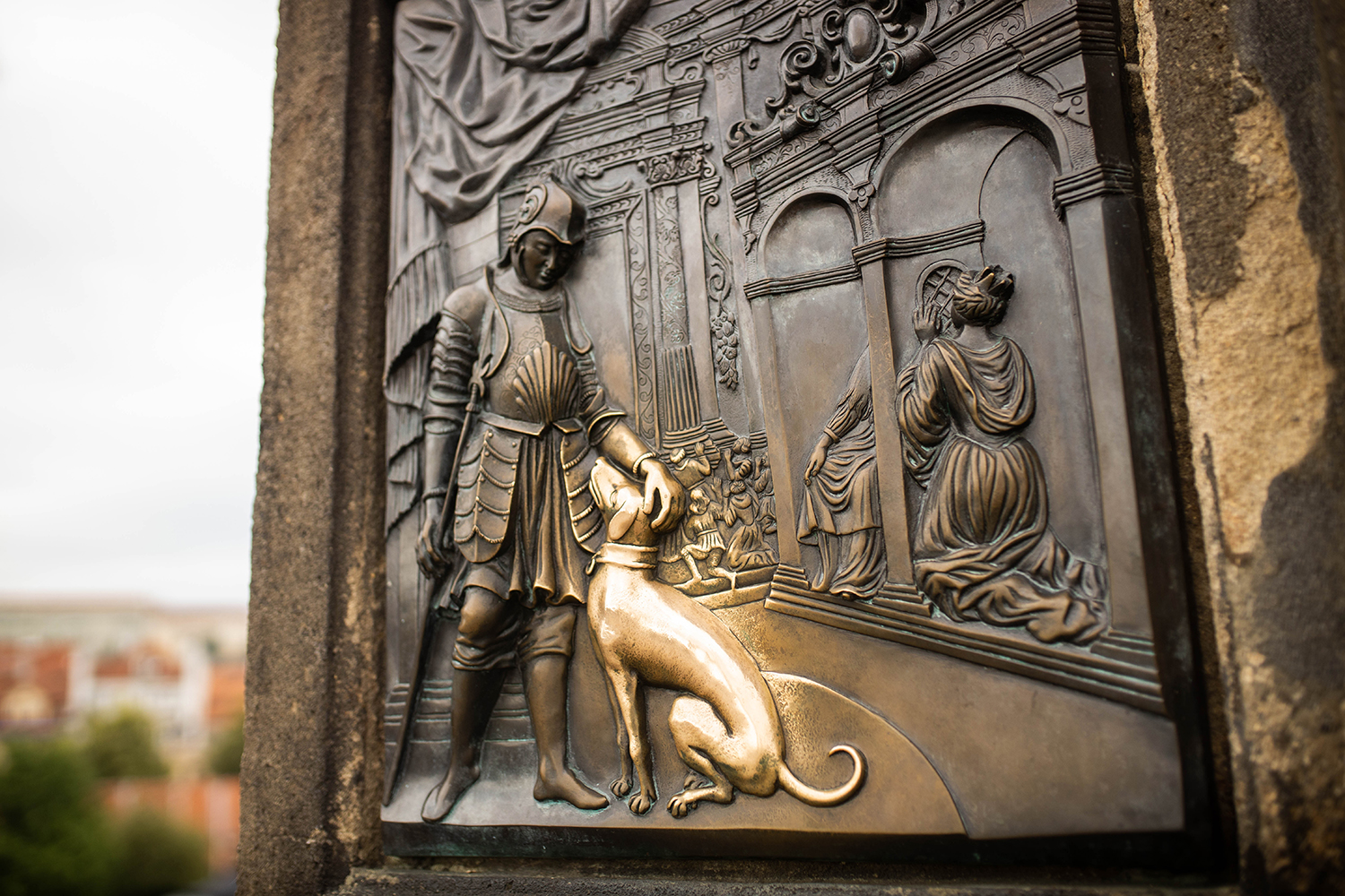 Ciekawostka nr 2 wiąże się ze zdobieniami mostu. Ma 16 łuków, 15 filarów i 30 rzeźb, w tym Nepomucena (jego często można spotkać na Dolnym Śląsku). łatwo go zlokalizujecie na moście- płaskorzeźba z pieskiem jest wymacana i świeci się złotem jak psu... tego .. nooo.. Z Nepomucenem wiąże się legenda którą zostawiam Wam o TUTAJ