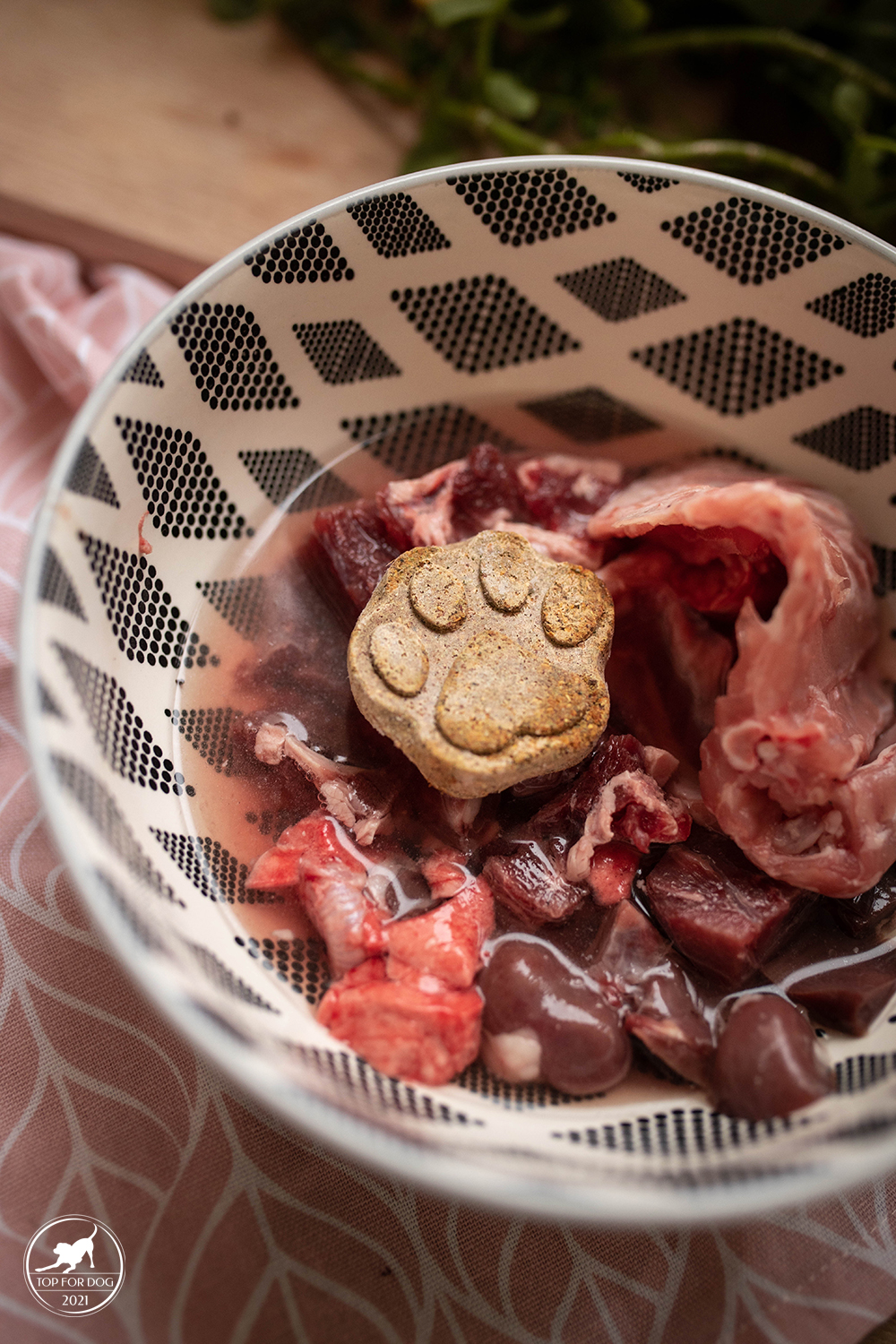 - Każde menu na dzień, w naszym przypadku składało się z mięsa – mięśni, podrobów i mięsa z kością. Ilość i stosunek procentowy podroby-kości- mięso był wyliczany dla Bu zgodnie z obowiązującymi normami w ramach diety BARF