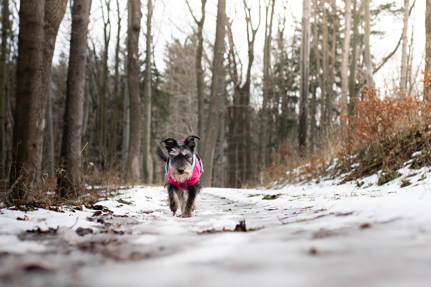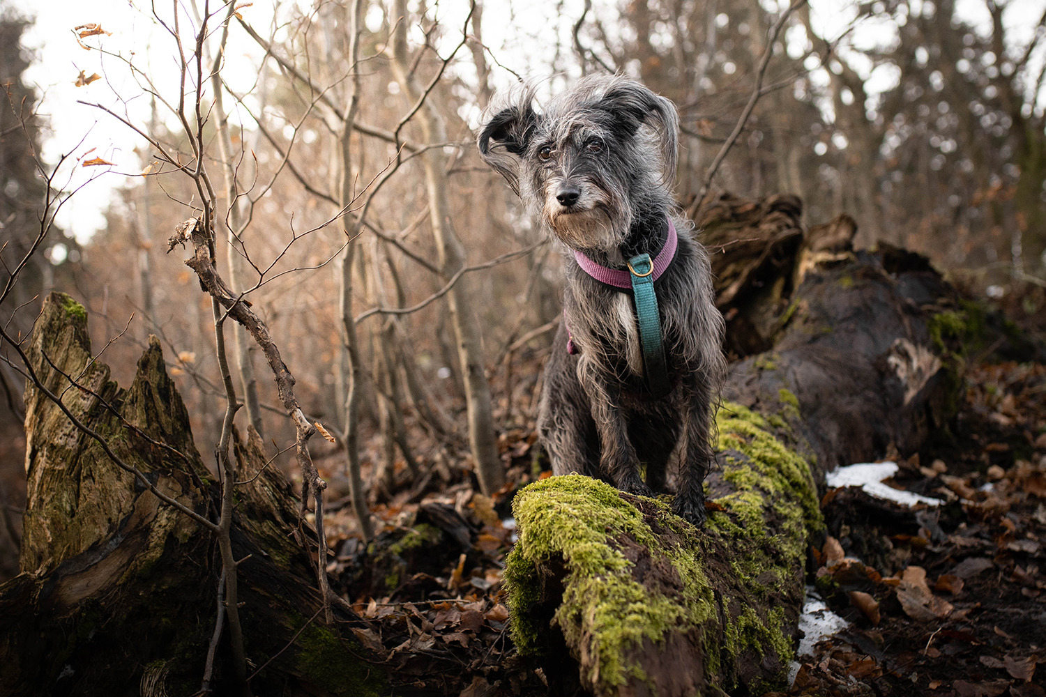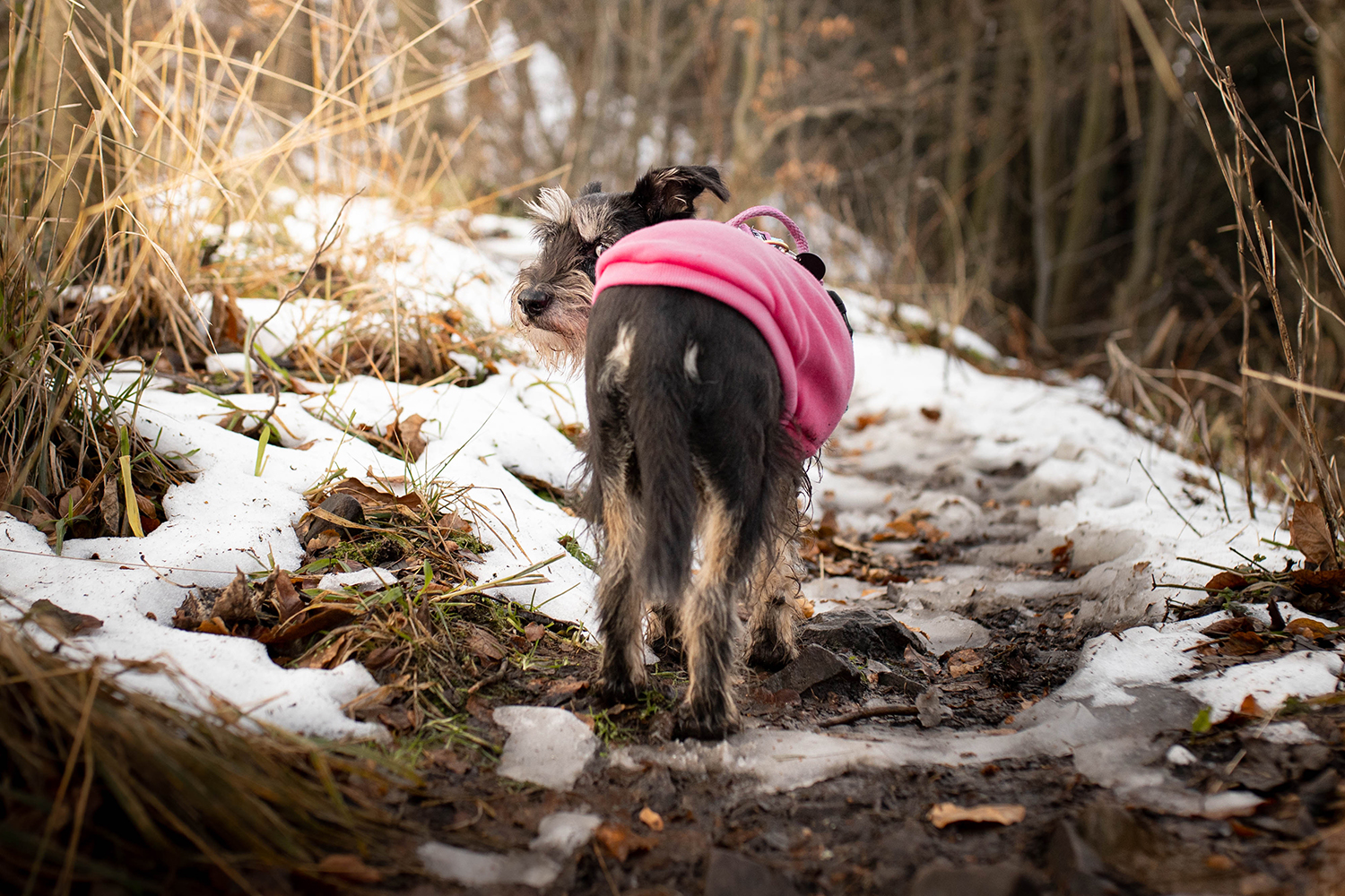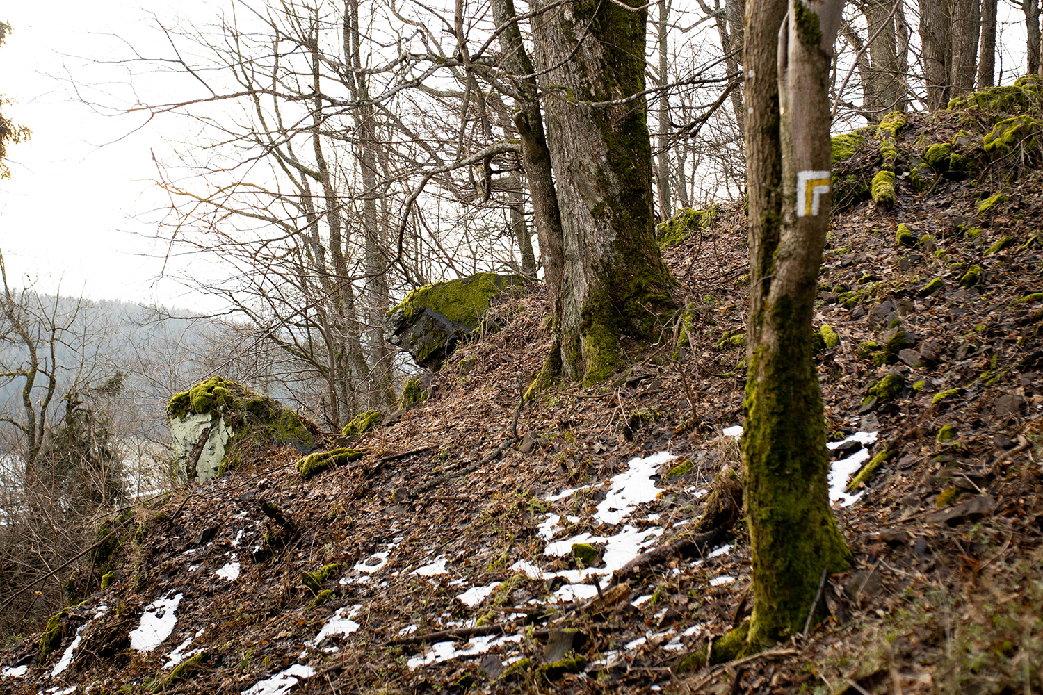 Ale prawdziwa zabawa zaczyna się na ostatnim odcinku wejścia na same ruiny zamku. Żółty szlak pnie się ostro w górę, a w taką aurę jak nasza było tu na prawdę ślisko. To są takie chwile, kiedy przydaje się opanowanie psa/ mały pies, którego łatwo wyhamować na zejściach/ zapięcie z przodu na szelkach. Cokolwiek by to nie było, uważajcie na całej trasie, łatwo tu o potknięcie i kontuzję .