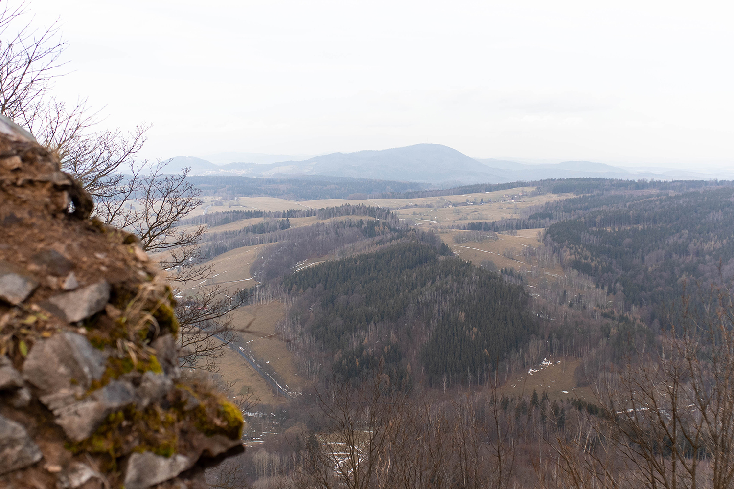 Na szczycie można ponapawać się widokami. dać sobie wytarmosić włosy, albo jak Suczydła – brody podmuchami wiatru. Jest tu miejsce na ognisko. Raczej dziko zaaranżowane. My woleliśmy nawet z kanapkami zejść bezpiecznie niżej i dalej. Szczególnie, ze plany na trasę były ambitne. Po ruinach – szczyt! Bo jak kolekcję powiększać to o kilka zdobyczy.