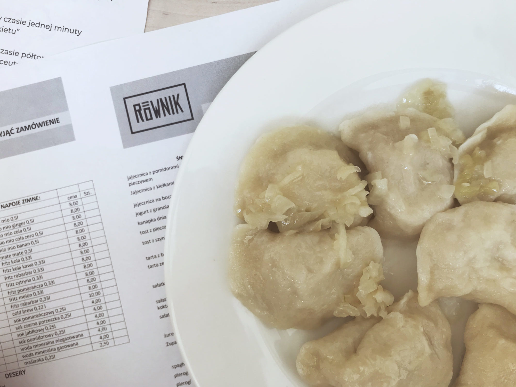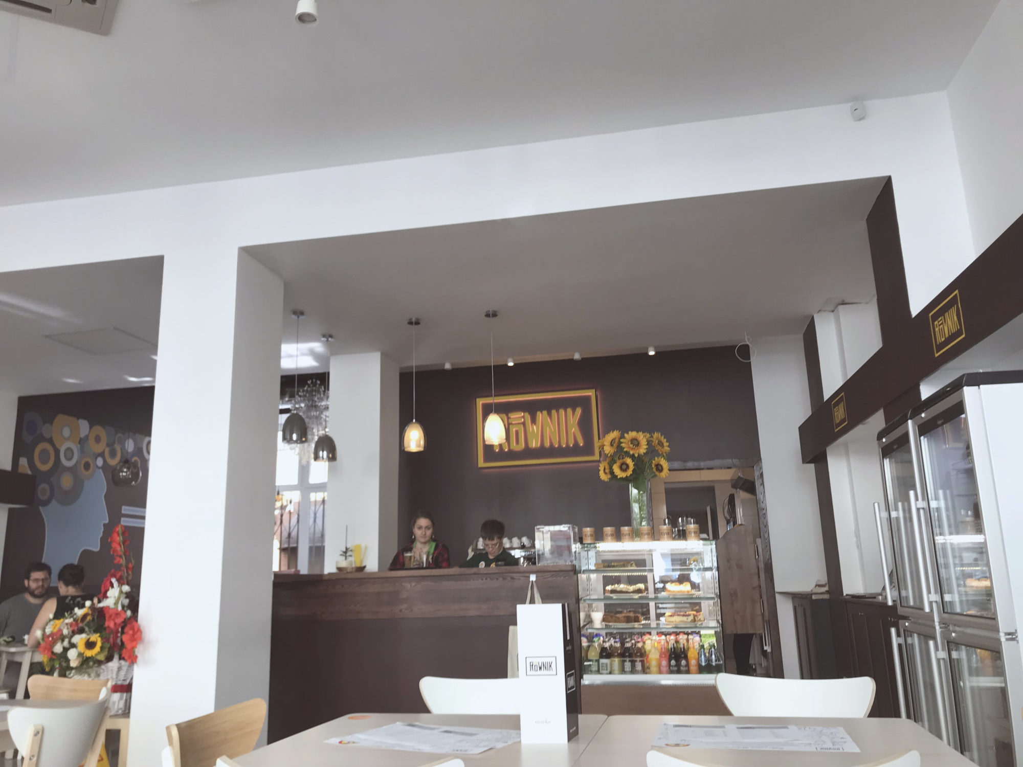 Ta miejscówka to Cafe Równik. Trochę kawiarnia, bo kawkę i pyszne ciacho dostaniemy. Trochę knajpka, bo zjedliśmy z P. wielką porcję dobrych pierogów ruskich (ocena smakosza, który mógłby zajadać się ruskimi codziennie, aż do rozpęku, więc wiecie 😉 )
