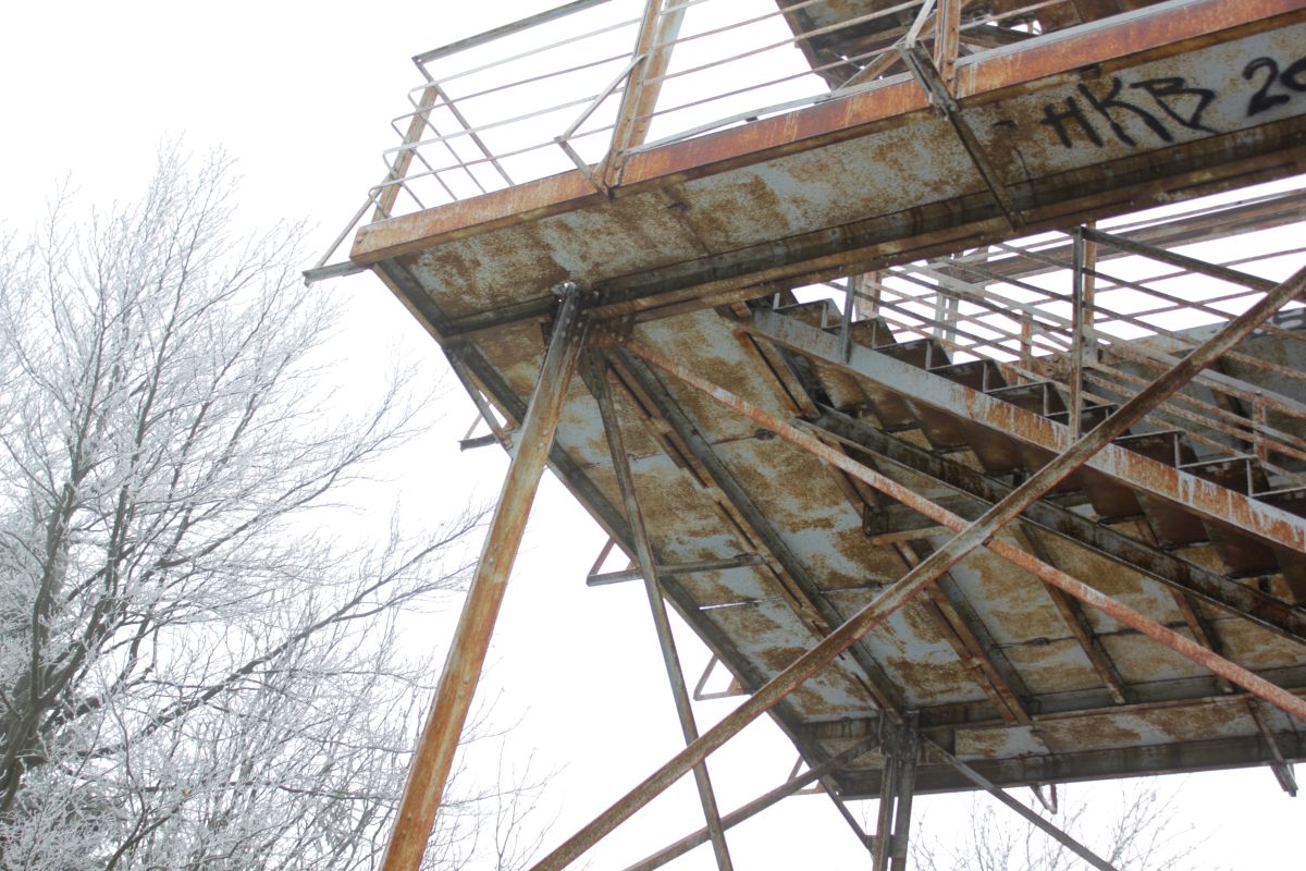 (Ścieżka poprowadziła nas przez szczyt Żmij na Kalenicę. Jest tam miejsce ogniskowe ? Trochę zasyfione, cóż, nie każdy wie, że w ognisku nie spala się wszystkich śmieci jakie mamy przy sobie, ale jak widać jest to wiedza zarezerwowana dla nielicznych :/ Jest też wiata o której stanie od środka lepiej nie mówić, a szkoda bo termosowa herbata musiała zostać wypita pod atrakcją szczytu czyli.. wieżą widokową 🙂 Ja się nie odważyłam na nią wejść, usprawiedliwiłam się, tym, że przecież nie zostawię Pufioka samego na dole ;P Chłopaki odważne, weszły, wieża stoi, więc chyba aż tak zardzewiała nie jest 🙂 )