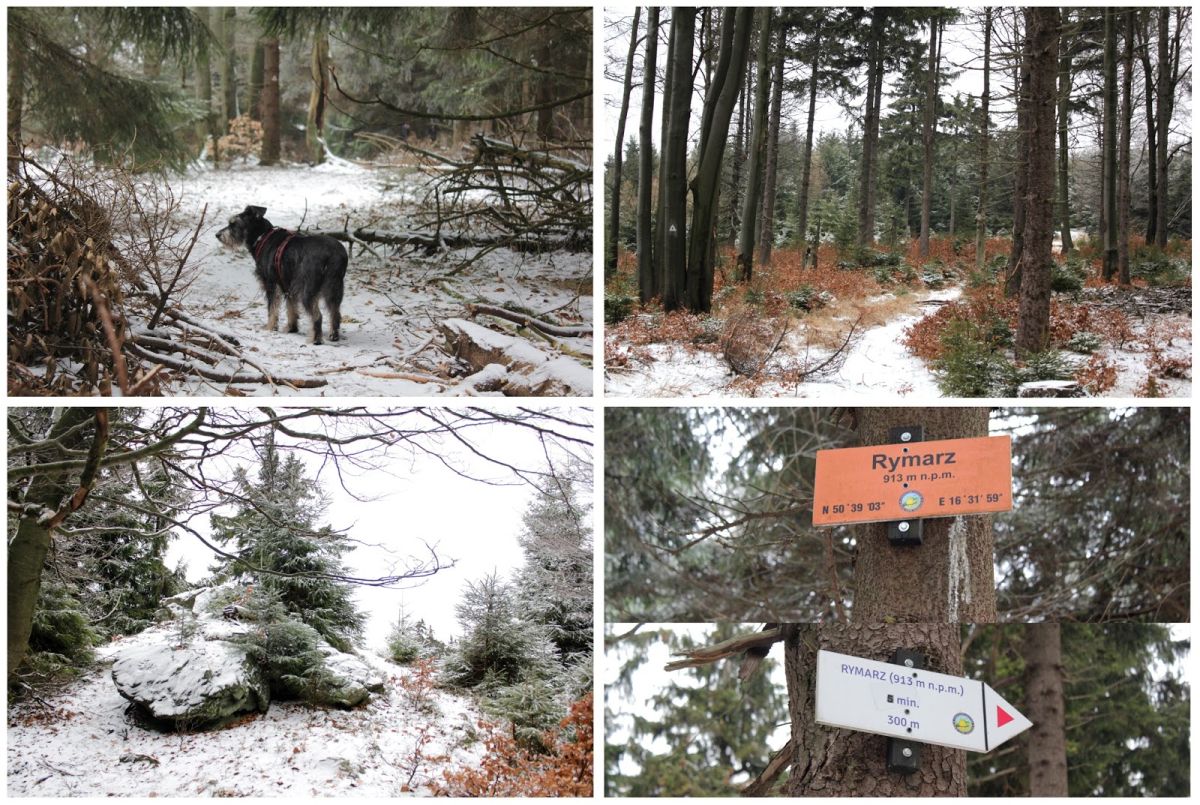 (Zaraz za Zimną Polaną jest znak na szczyt Rymarz, trzeba przejść podobno 300 m. Może i…, trochę pod górkę, ale głupio przechodzić obok i nie „zaliczyć” tego szczytu. Przy czym uwaga, łatwo go przeoczyć. Byliśmy pewni że ta kupka kamulców to właśnie on, wracając okazało się, że „ustawowy” szczyt już minęliśmy a jest on oznaczony tabliczką ukrytą na drzewie po lewej stronie, takie urozmaicenie wędrówki – znajdź szczyt 🙂 )