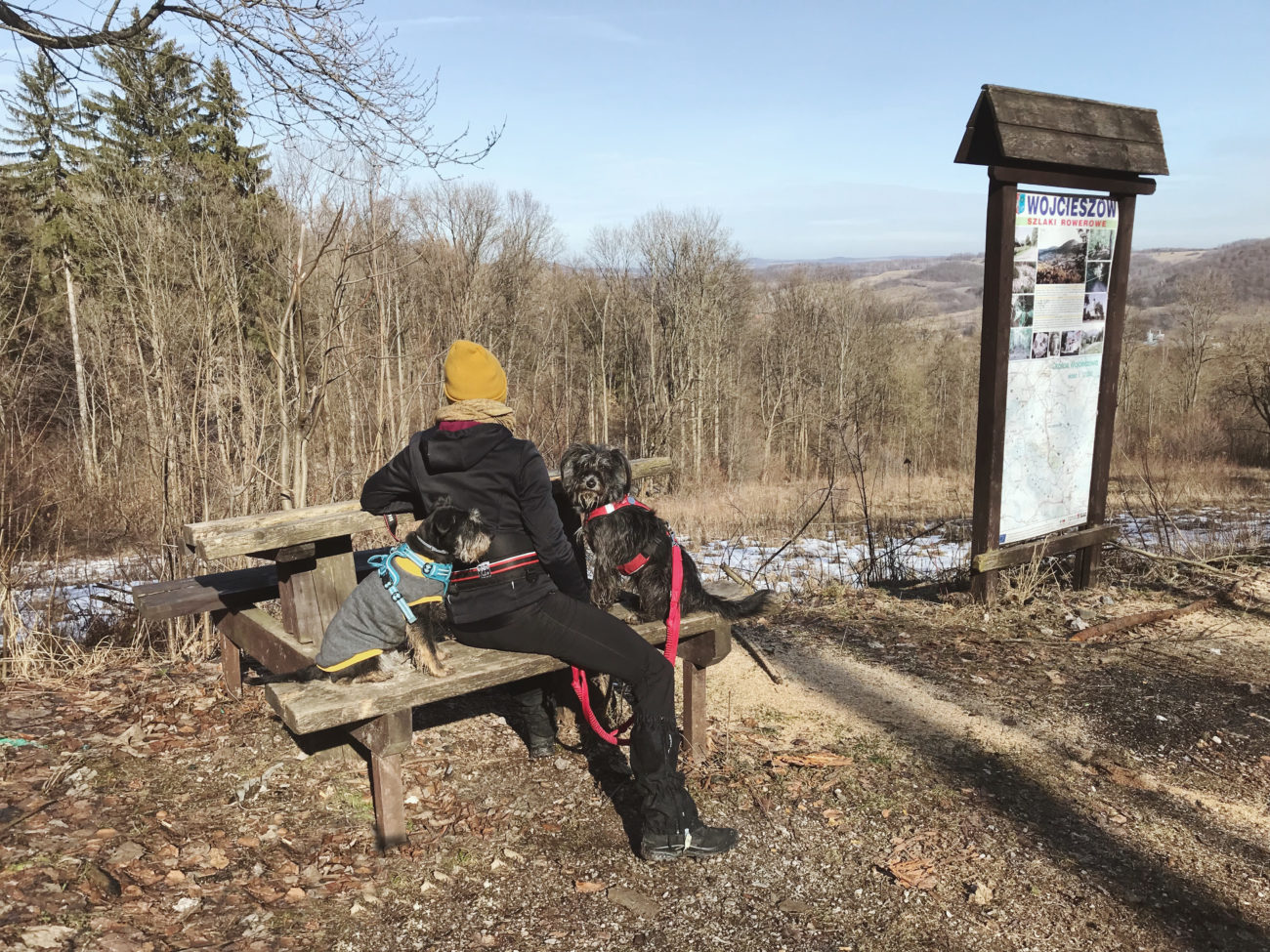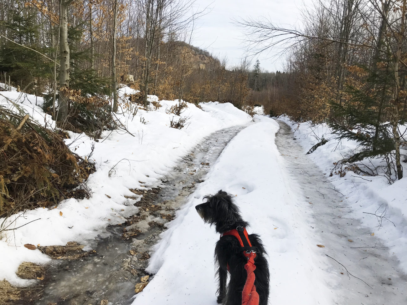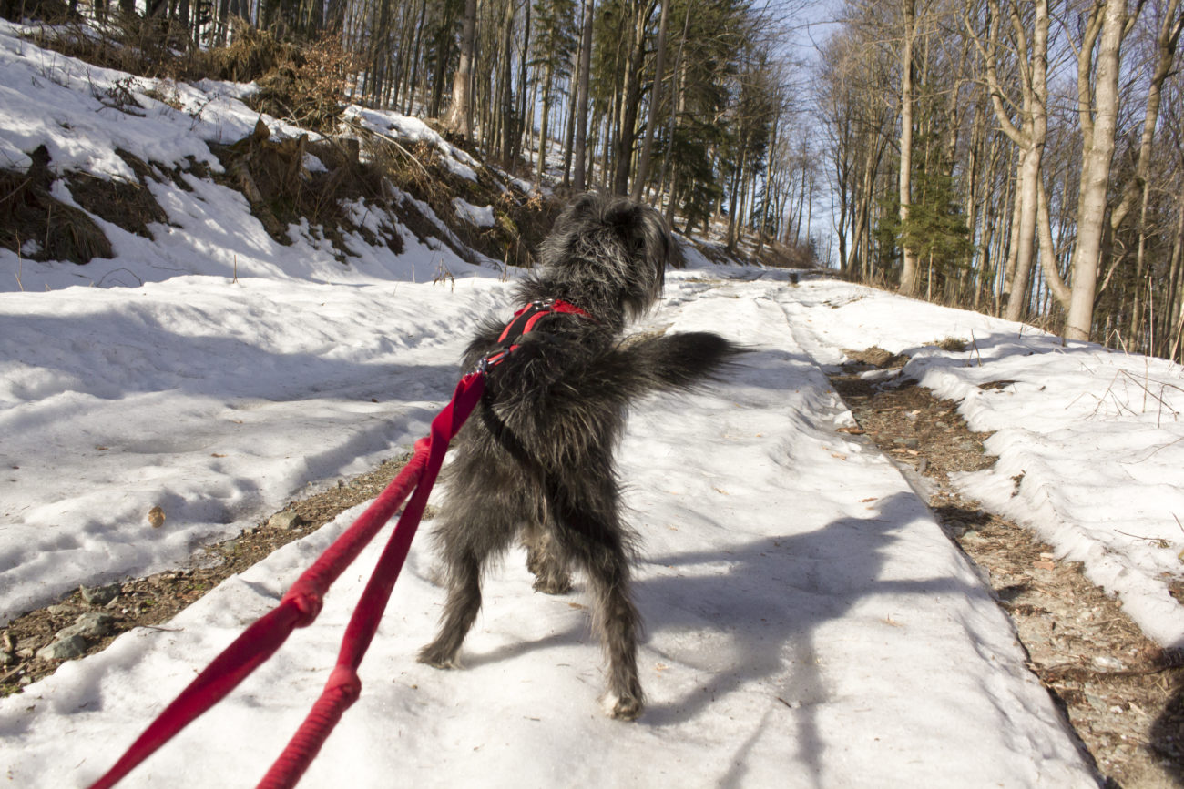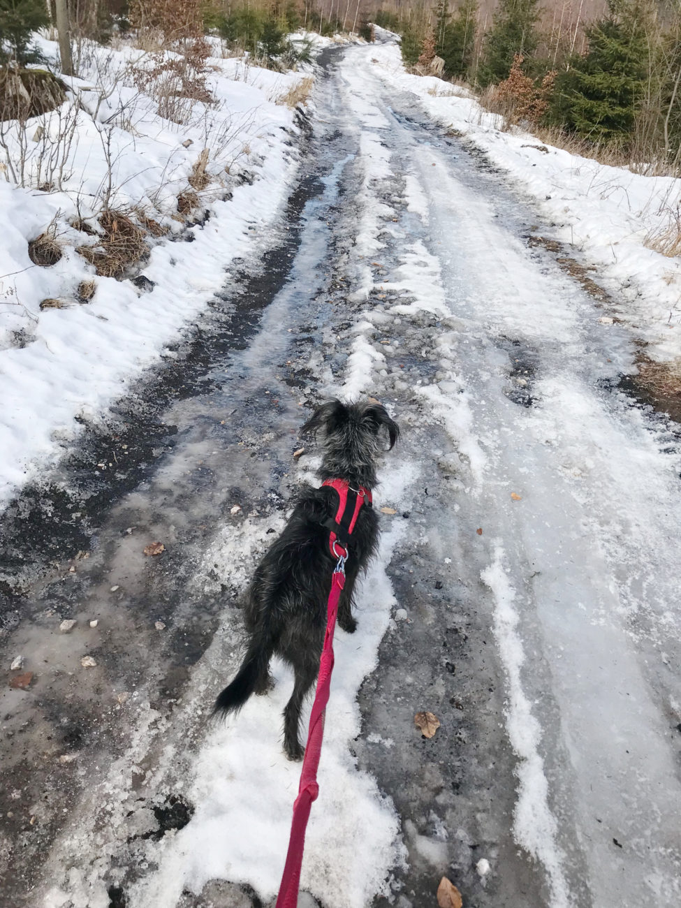 A ścieżki jakie my , dwie kobity i suki też dwie, czy czteroelementowe stado obrały to szlak żółty, który poprowadzi nas bardzo długo, przez dobrze utrzymane i oznakowane przestrzenie. Oczywiście o takiej porze jak teraz można spodziewać się zarówno suchej ścieżki, lodowiska, głębszego, zamarzniętego śniegu, z lekką nutką błocka. Błocko na koniec, lodowisko przez większą część wejścia , poza samym początkowym etapem. Kto ma raczki, niech nie wpada w zadumę filozoficzną jak ja, „czy to aby warto targać”. Warto, choćby dla szpanu psychicznego, że się ma ! Ja nie zabrałam i żałowałam z całego serca. A o tak zły wybór obwiniam piękną drogę na początku- sami zobaczcie