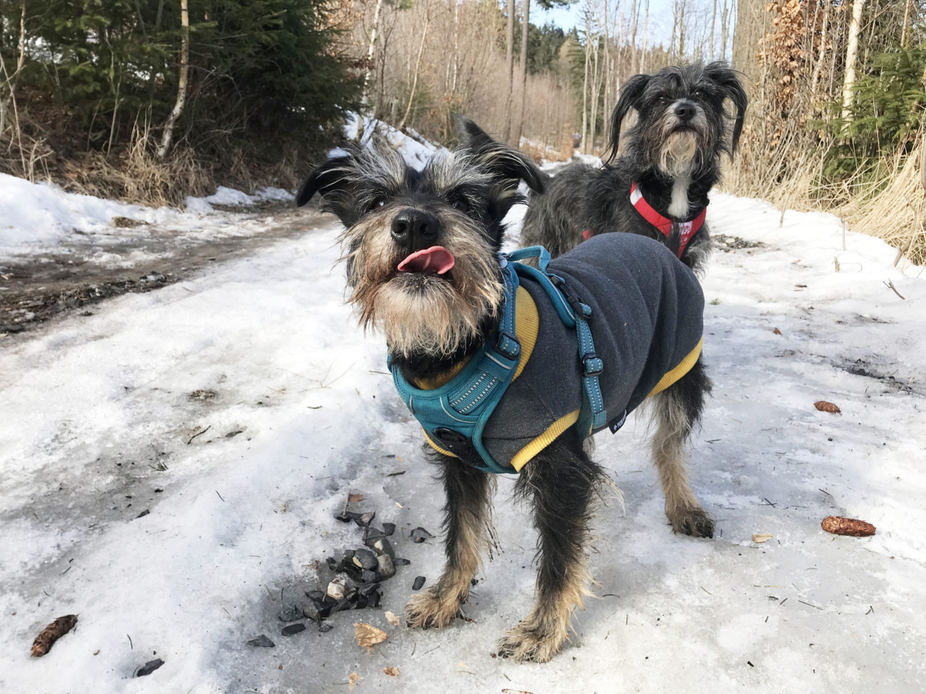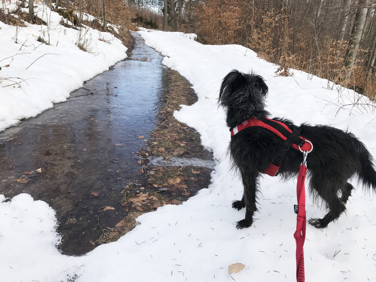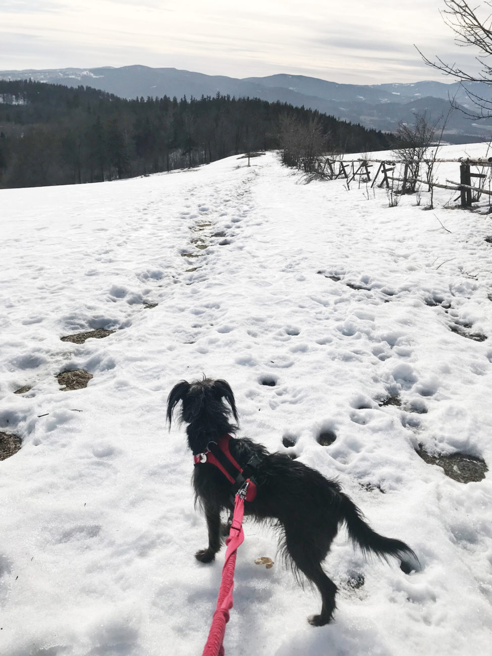 A ścieżki jakie my , dwie kobity i suki też dwie, czy czteroelementowe stado obrały to szlak żółty, który poprowadzi nas bardzo długo, przez dobrze utrzymane i oznakowane przestrzenie. Oczywiście o takiej porze jak teraz można spodziewać się zarówno suchej ścieżki, lodowiska, głębszego, zamarzniętego śniegu, z lekką nutką błocka. Błocko na koniec, lodowisko przez większą część wejścia , poza samym początkowym etapem. Kto ma raczki, niech nie wpada w zadumę filozoficzną jak ja, „czy to aby warto targać”. Warto, choćby dla szpanu psychicznego, że się ma ! Ja nie zabrałam i żałowałam z całego serca. A o tak zły wybór obwiniam piękną drogę na początku- sami zobaczcie