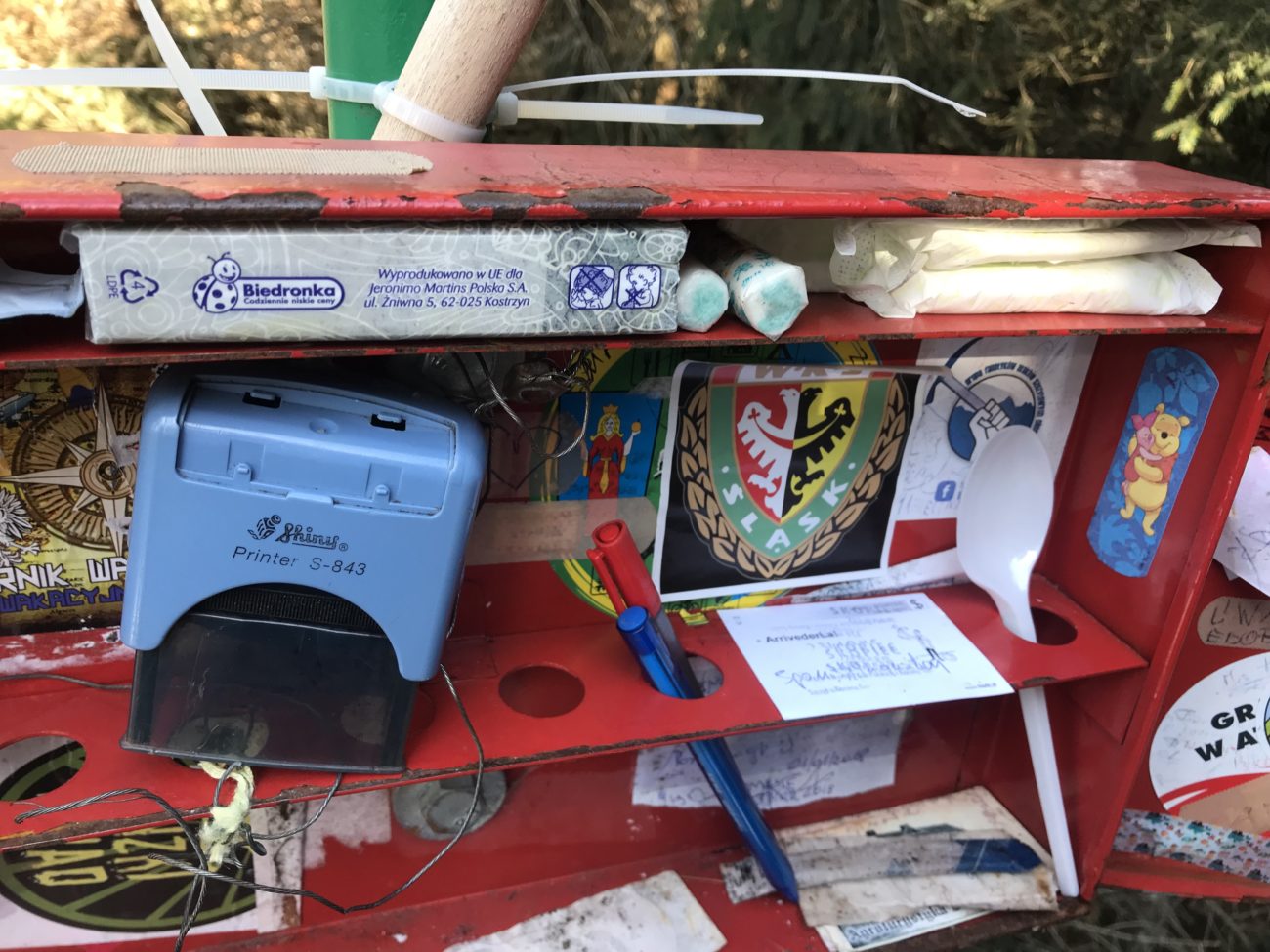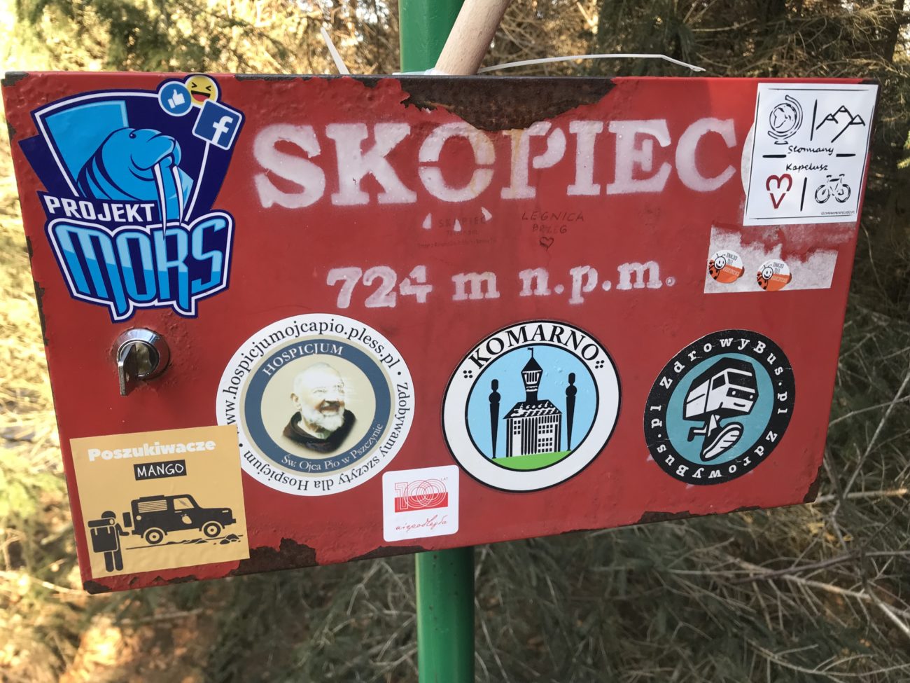 Z Przełęczy Komarnickiej odbijamy na ostatnie podeście, prosto na Skopiec. Szlak niebieski. Znowu niewymagające, spacerowe. Szczyt oznakowany bardzo dobrze, nie da się ominąć. Jest tabliczka i cud miód skrzyneczka ze strategicznymi rzeczami, które mogą się przydać wędrowcom oraz pieczątka. W sam raz do travel bujo czy książeczki PTTK.