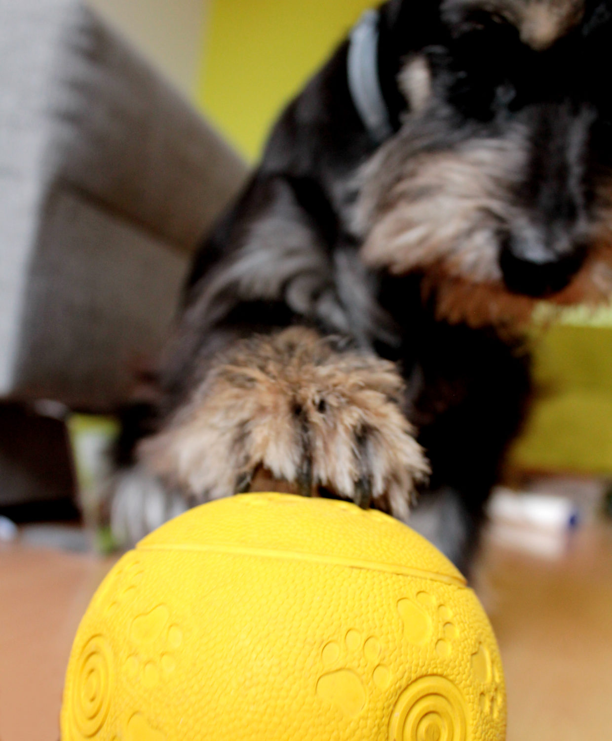Oczywiście był też problem zbyt łapczywego połykania karmy, krztuszenia się nią, oddawania, zjadania ponownego, znowu krztuszenia się tym samym.. ot, taka codzienność z Pufą. Groszki idealnie nadawały się do zapakowania do miski spowalniającej jedzenie (KLIK) czy do kuli. Podwójna korzyść – pies je i się wyjątkowo nie dławi, a i poruszać się trochę musi, jeśli cokolwiek z tej kuli ma wypaść. Przypominam – każda okazja do zmuszenia Pufy do ruszenia zadka po dziś dzień jest na wagę złota 🙂