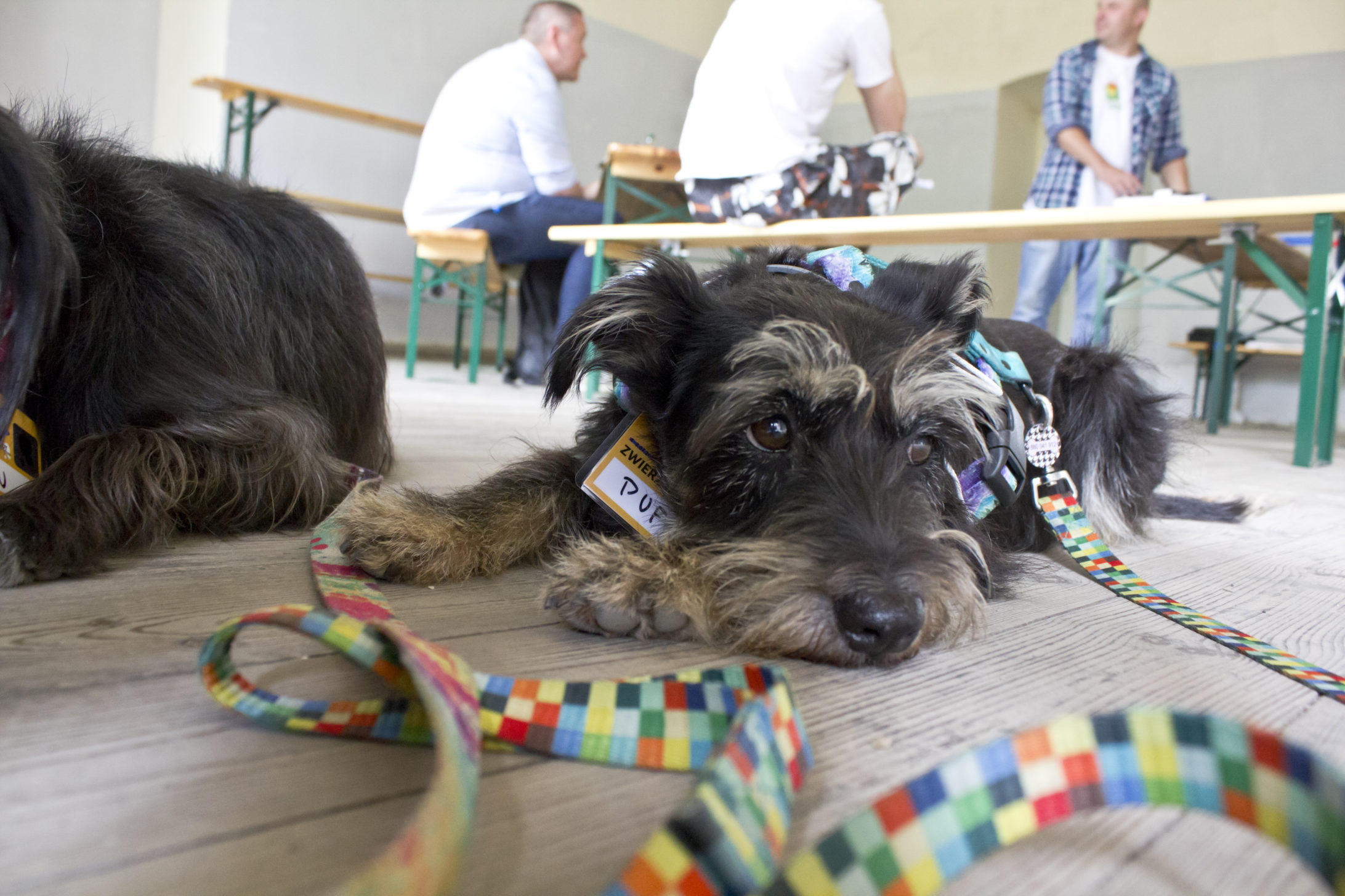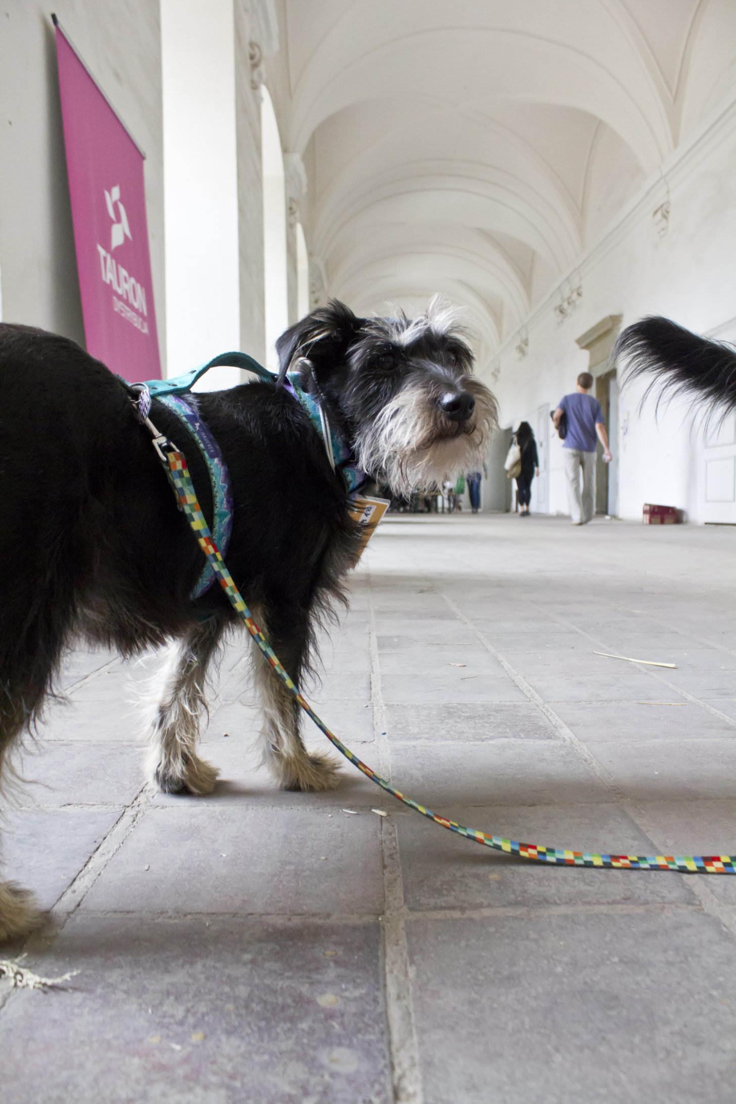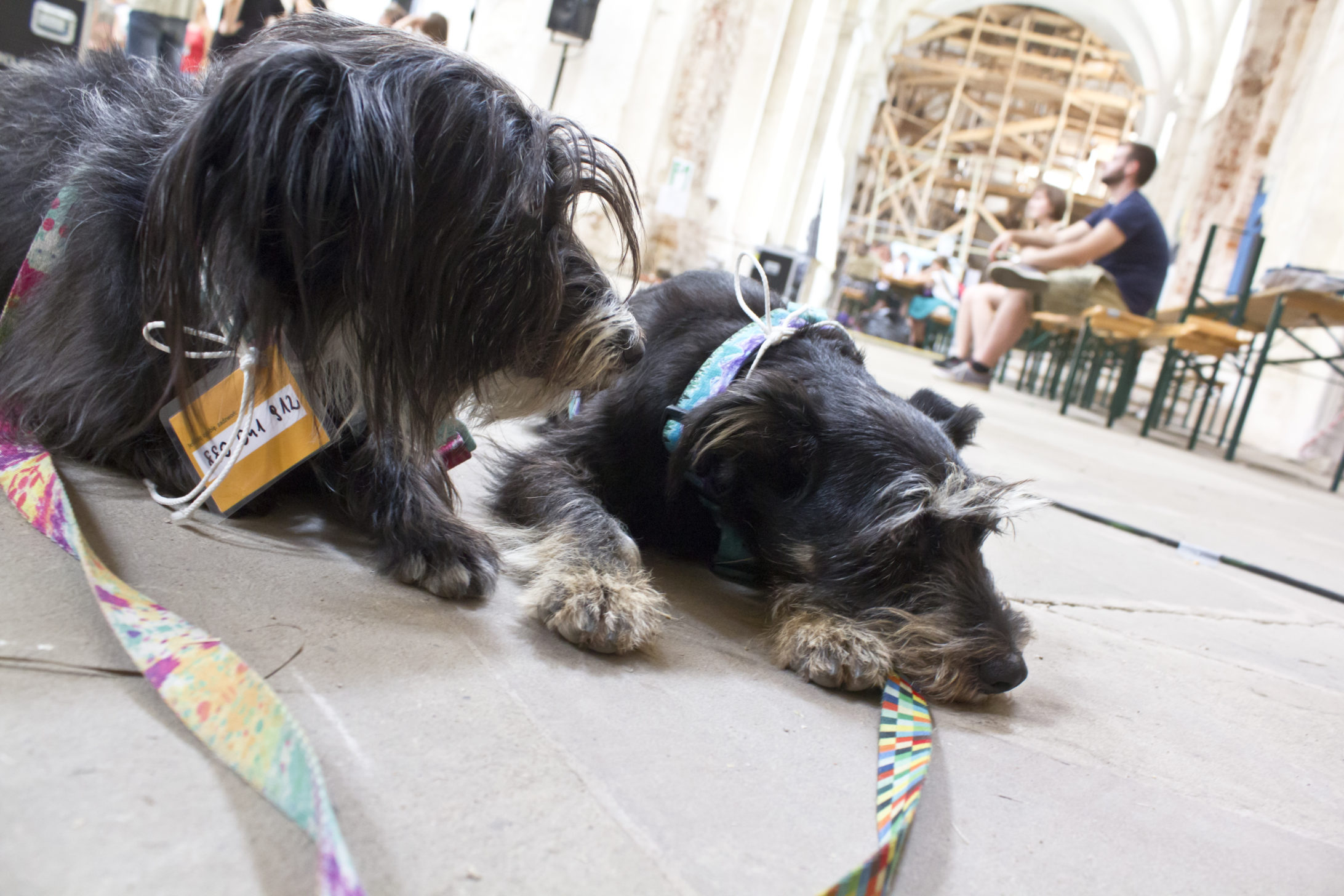 Kawiarnie będące jednocześnie miejscami dyskusji, akcje i wydarzenia mające miejsce na korytarzach, koncerty w dawnym wirydarzu, kaplicy, sklepionych łukowo salach. Dla mnie było to przeżycie i ze względu na wiedzę i doświadczenia jakie zdobyłam ale też czysto estetyczne. A suki? Suki miały się nad wyraz dobrze. Z jednej strony jest to zasługa miejsca, braku natarczywych dźwięków, przestrzeni. Z drugiej, jestem dumna z siebie, tak – tym razem z siebie, że moja praca nie poszła na marne. Widzę, że suki, a szczególnie dotyczy to Bu i jej początkowej nadpobudliwości z jaką do mnie trafiła, potrafią położyć się i wychillować w różnych warunkach. Nawet te, na pozór trudne, nie stanowią problemu. Nie są nim ani dźwięki, ani światła, ani biegające wokół dzieci. Festiwal miał być ostatecznym sprawdzianem ogarnięcia Bu. Zdała go śpiewająco. Po obu sukach widać, że poznawanie nowych miejsc, zapachów i ludzi sprawia im frajdę. A dla mnie to najważniejsze 🙂