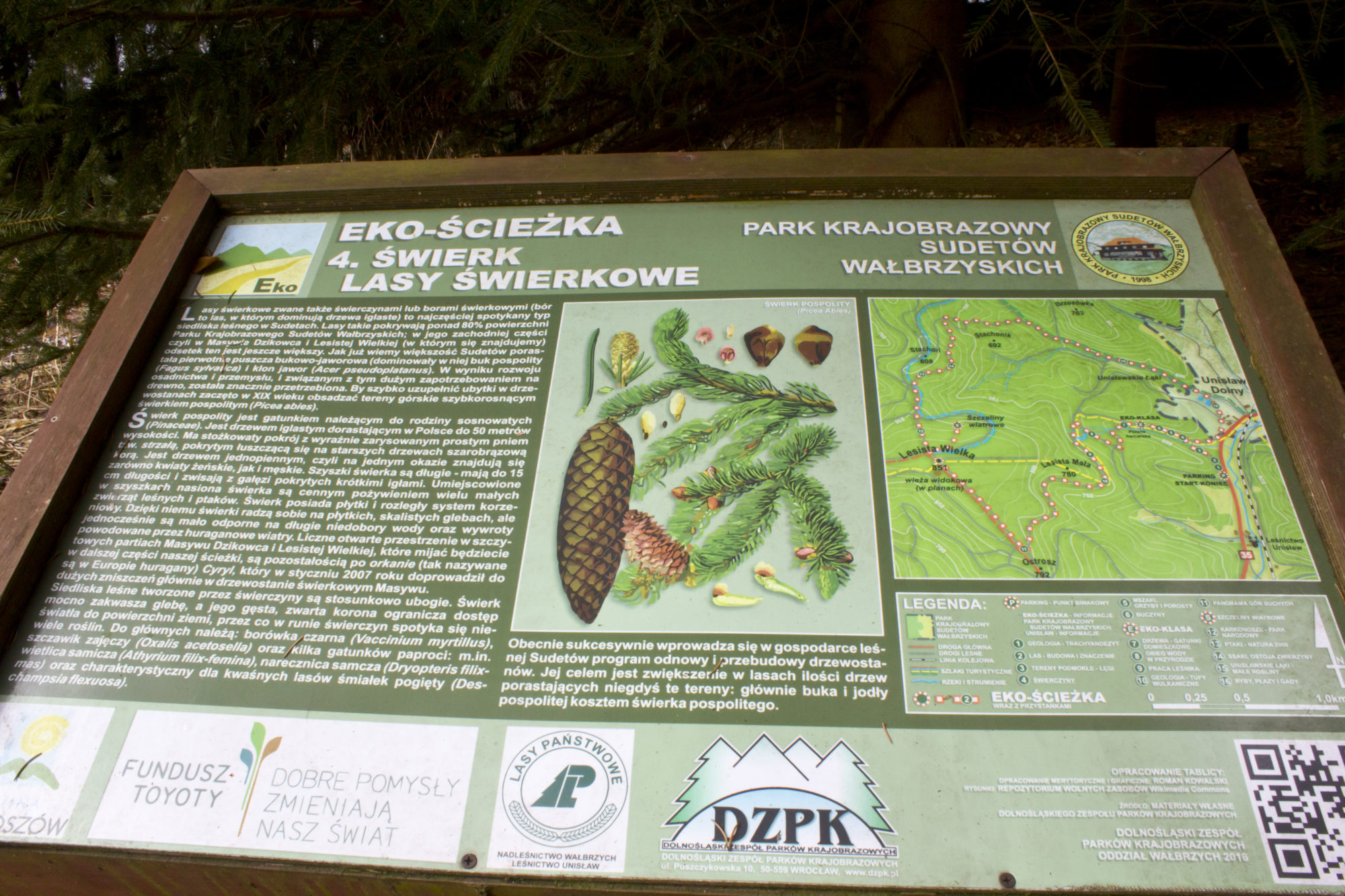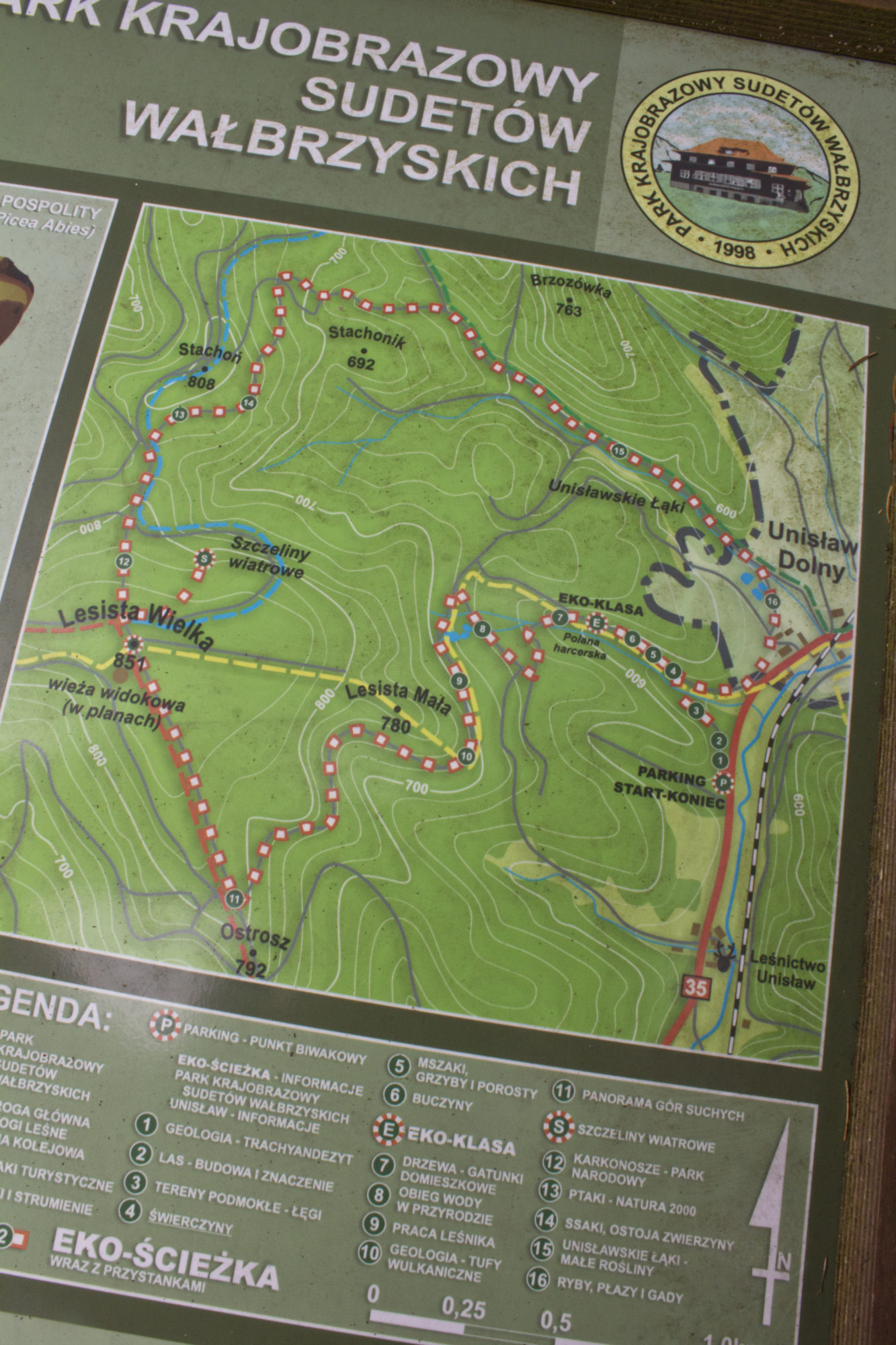 Po zejściu ze Stożka schodzimy do Unisławia , dalej pociskając szlakiem żółtym , kawałek przy drodze . Po przejściu na drugą stronę ulicy wchodzimy na znowu leśny fragment szlaku. I tu pokazała nam sie alternatywa: EKO ŚCIEŻKA, fragmentem pokrywająca sie z trasą przez nas wyznaczoną. My uznaliśmy że tym razem wolimy wejść na Lesistą, ale może następnym razem…