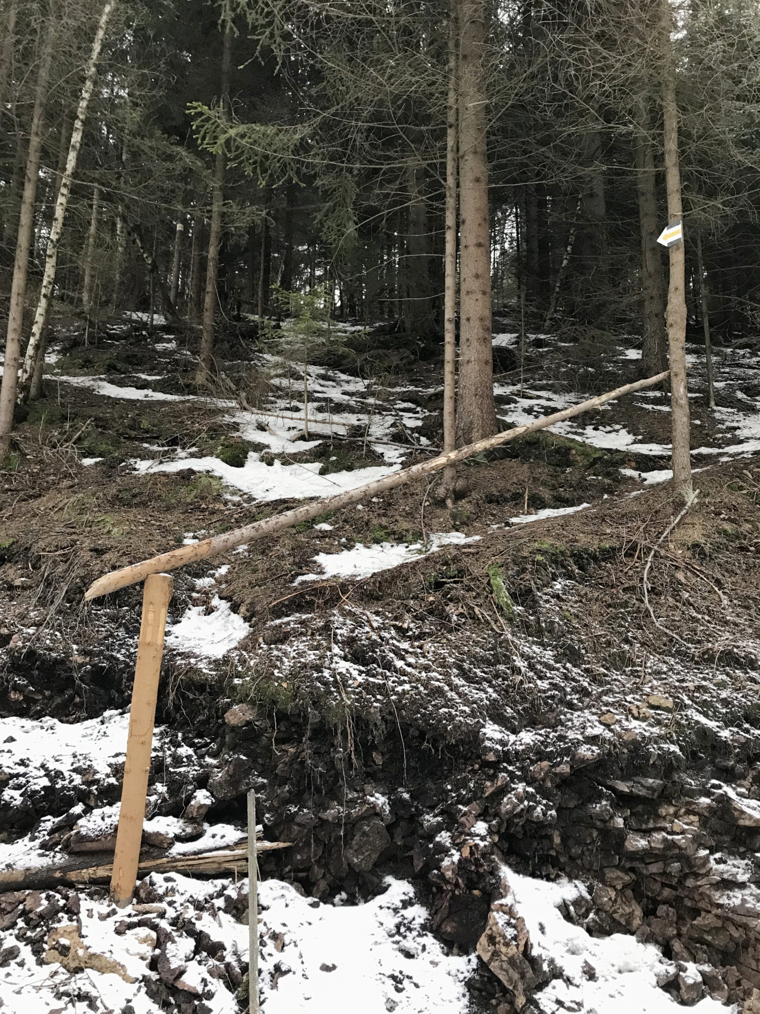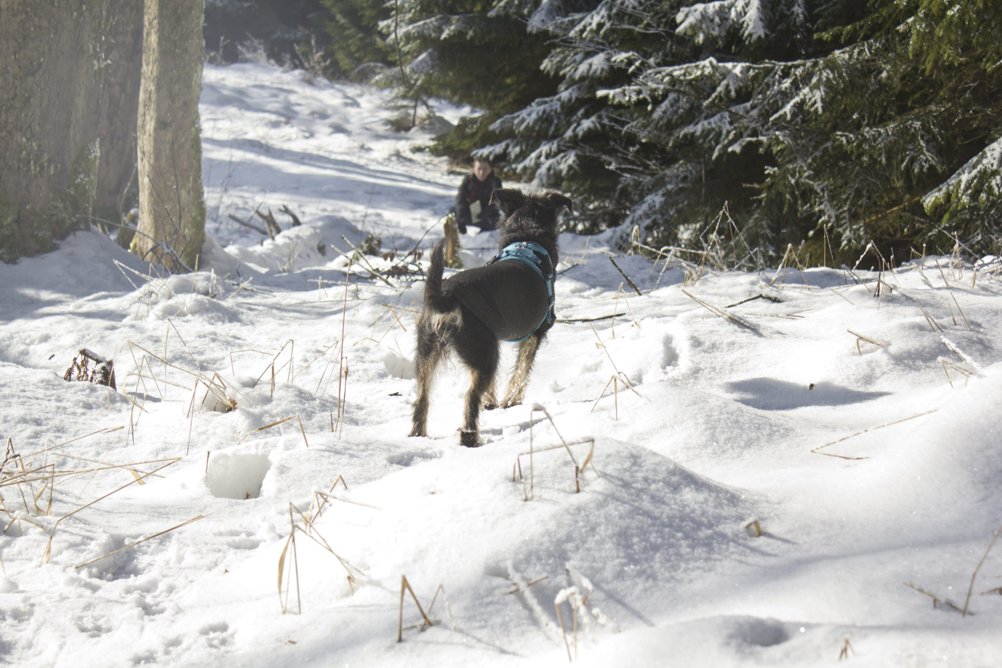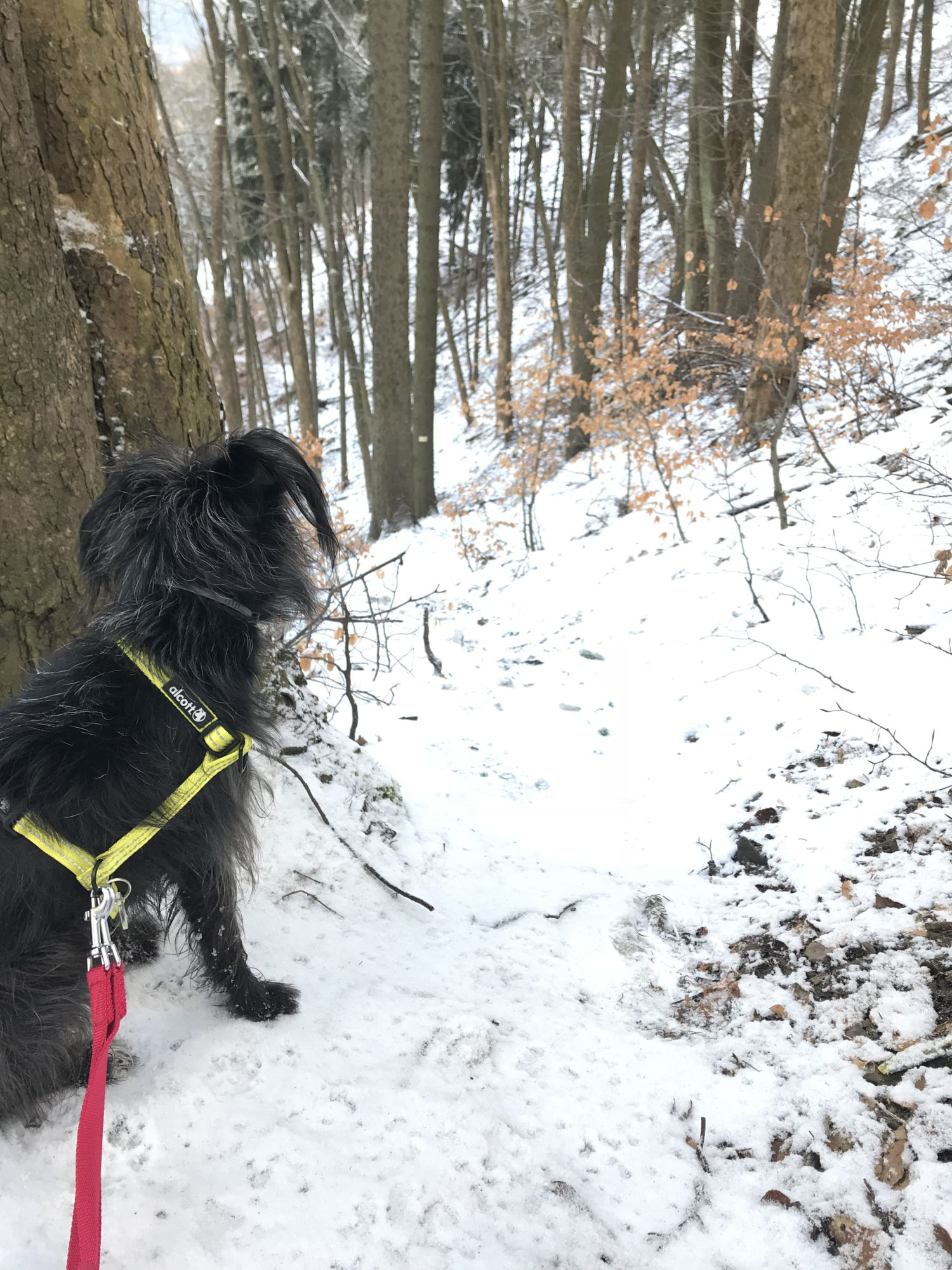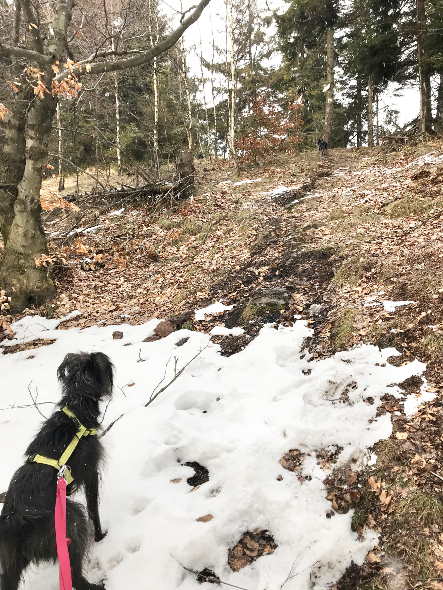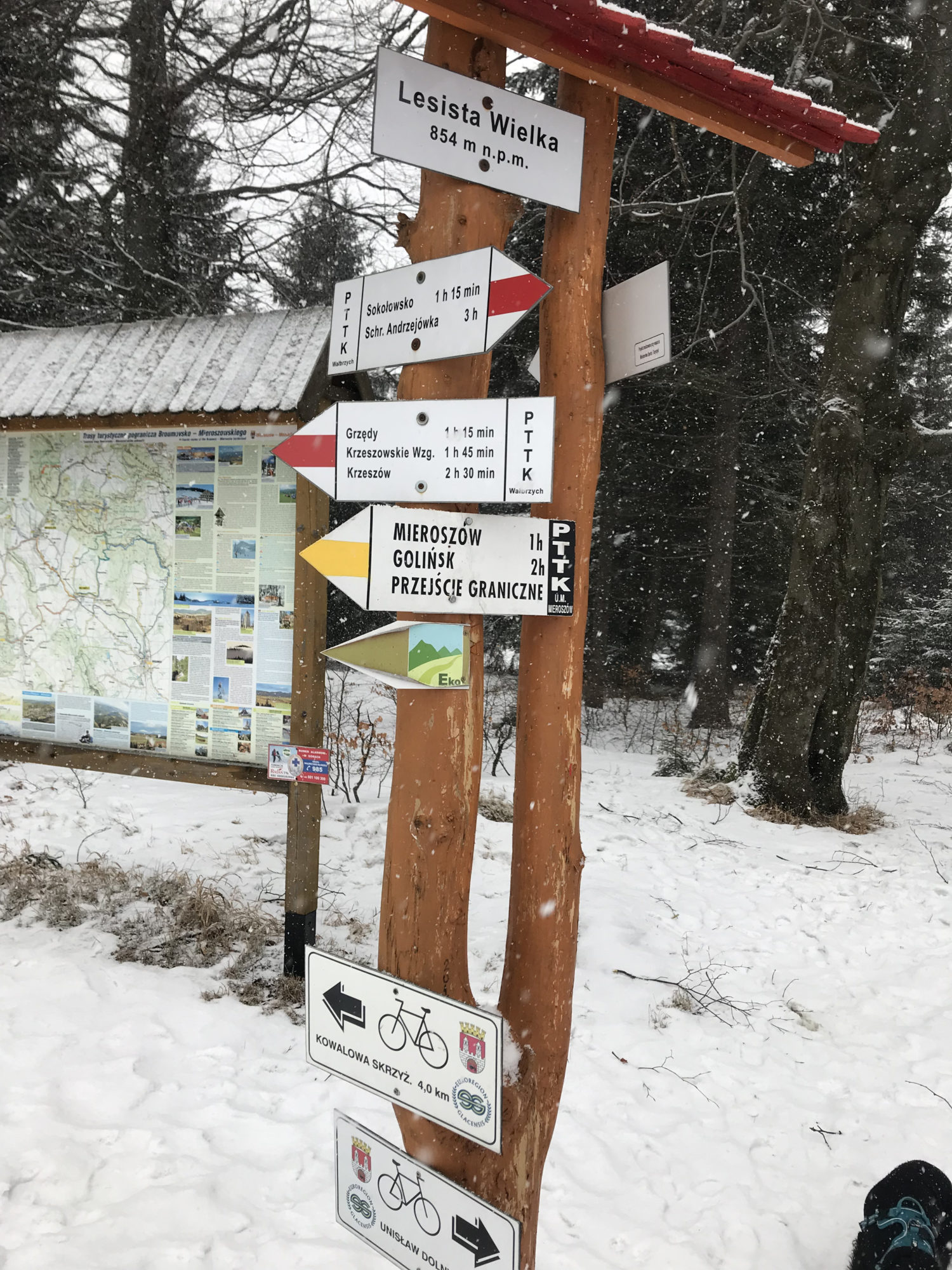 Drugi punkt zwrotny akcji nastąpił na wysokości Lesistej. Śnieg, łapachy Pufioka obklejone śnieżnymi kulami . I wtedy, idąc jak po sznurku szlakiem żółtym , wypatrując odbicie na szlak czerwony, który miał nas doprowadzić wprost do punktu wyjścia dochodzimy do skrzyżowania naszej żółtej ścieżki z inną, nieoznaczoną ale TAKĄ szeroką. Jeśli tamta wg mojej nomenklatury była „ludzka” to ta była „ludzko-tłumna”-szeroka, jakby , idealna do pretendowania w naszych oczach do czerwonej drogi. Na skrzyżowaniu wielka tablica, nówka nieśmigana z mapką (pierwsza fota poniżej) z moim ulubionym znaczkiem „tu jesteś” . lubię je bo nagle okazuje się gdzie doszłam i ile ma to wspólnego z tym co myślałam na temat swojego położenia 😉