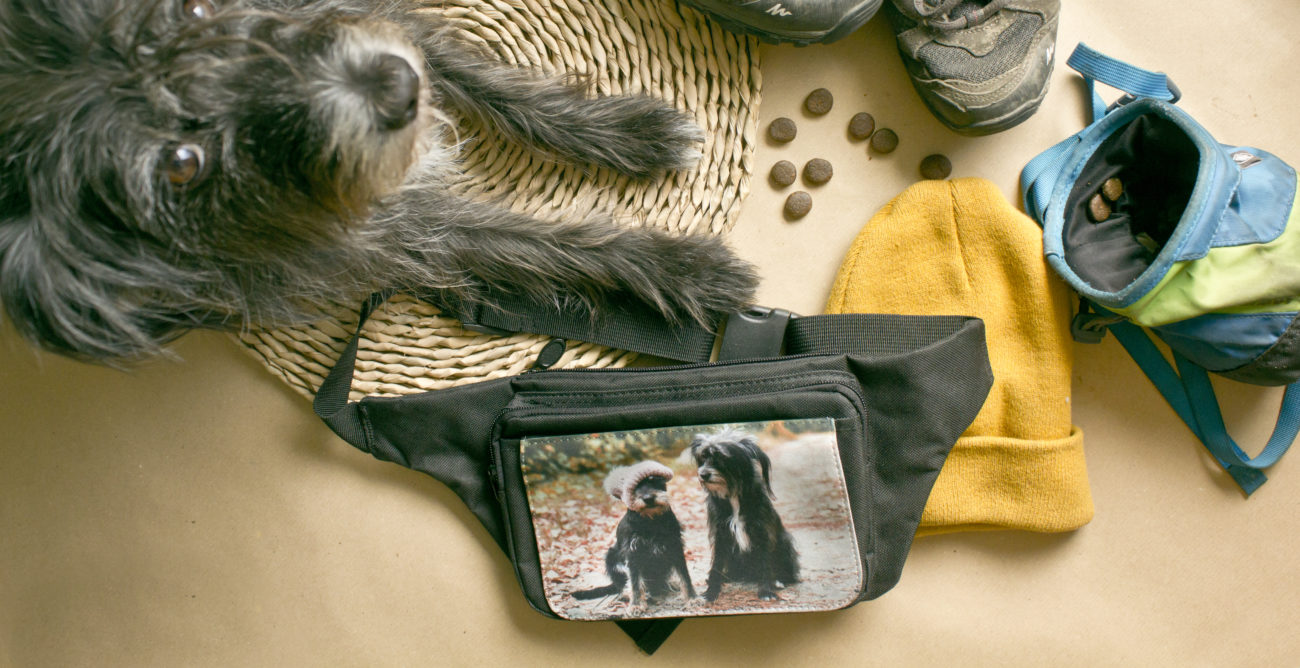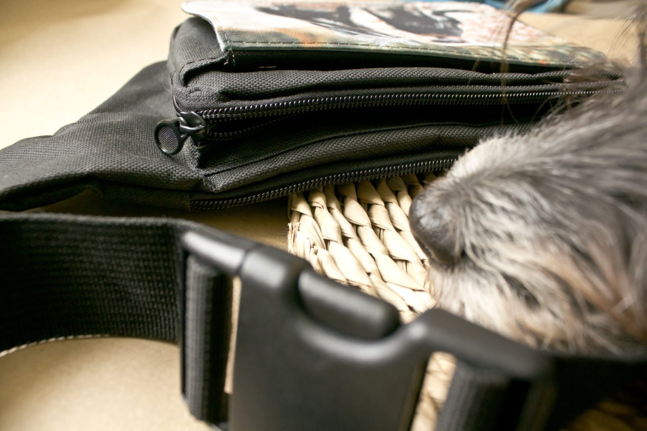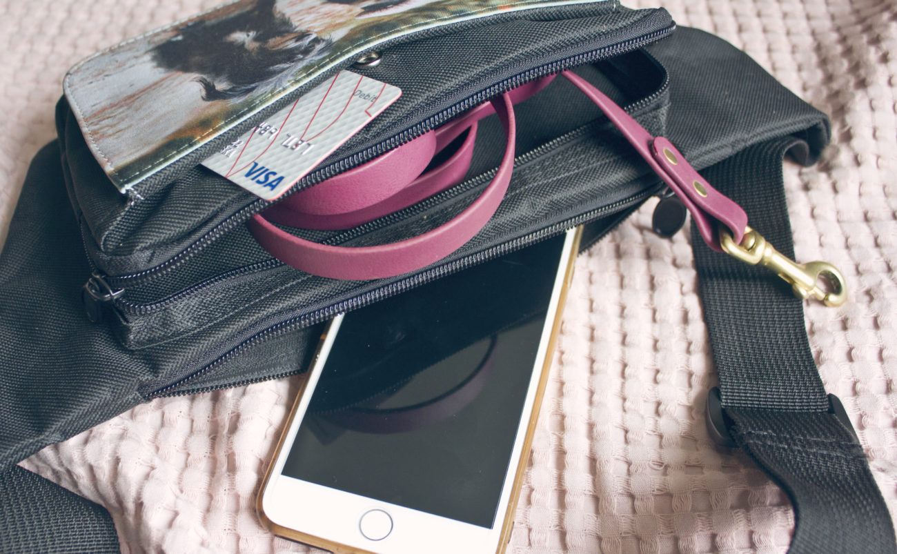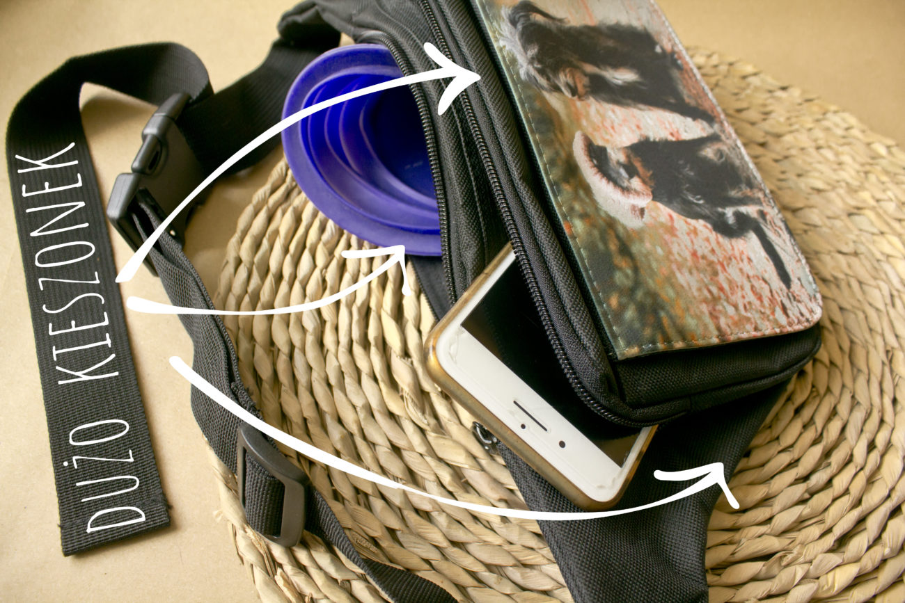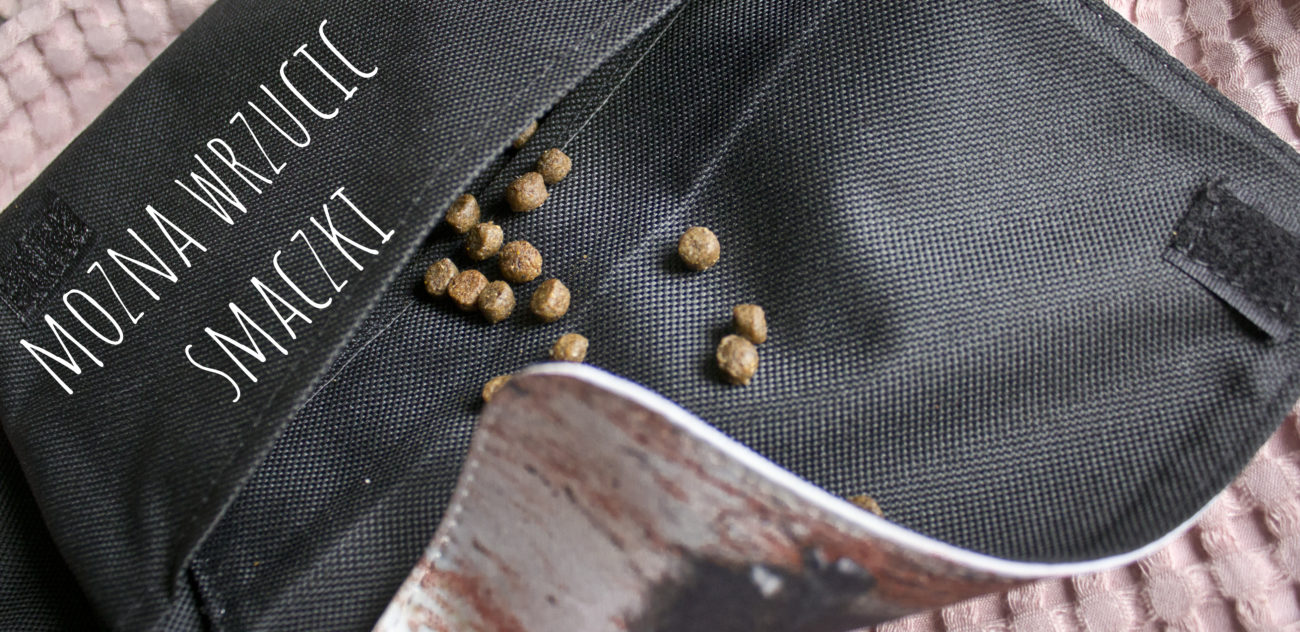 To minimum. Jeśli wiem , że zahaczam o knajpkę wciskam też silikonową michę na wodę. Do paska przyczepiam nasz zdezelowany woreczek na smaki. Niby nic ale trochę się tego robi. Wszytko muszę mieć tak upchnięte, żeby było to to bezpieczne czyli trudne do zgubienia, łatwo dostępne w kwestii telefonu 🙂 i żeby mi nie przeszkadzało spacerować.