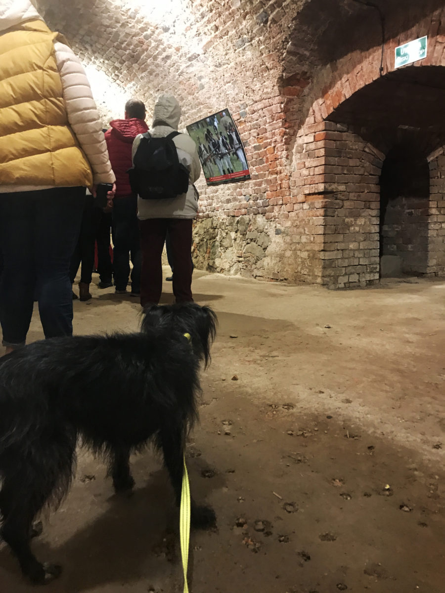 Po około 10-15 minutach spokojnego dreptania dochodzimy do Twierdzy. Bilet dla normalsów to 17 zł, tutaj też psy wchodzą bez problemu i za darmo. Mam nadzieję, że nikt nie zburzy tak dobrego mniemania o psiarzach -piesy na smyczy itd . My zawsze zwiedzając idziemy ostatni, zamykając stawkę. W grupie , na nierównej powierzchni, przy średnim oświetleniu nie trudno o nadepnięcie czy popchnięci, szczególnie takich szczurków jak Pufostado.