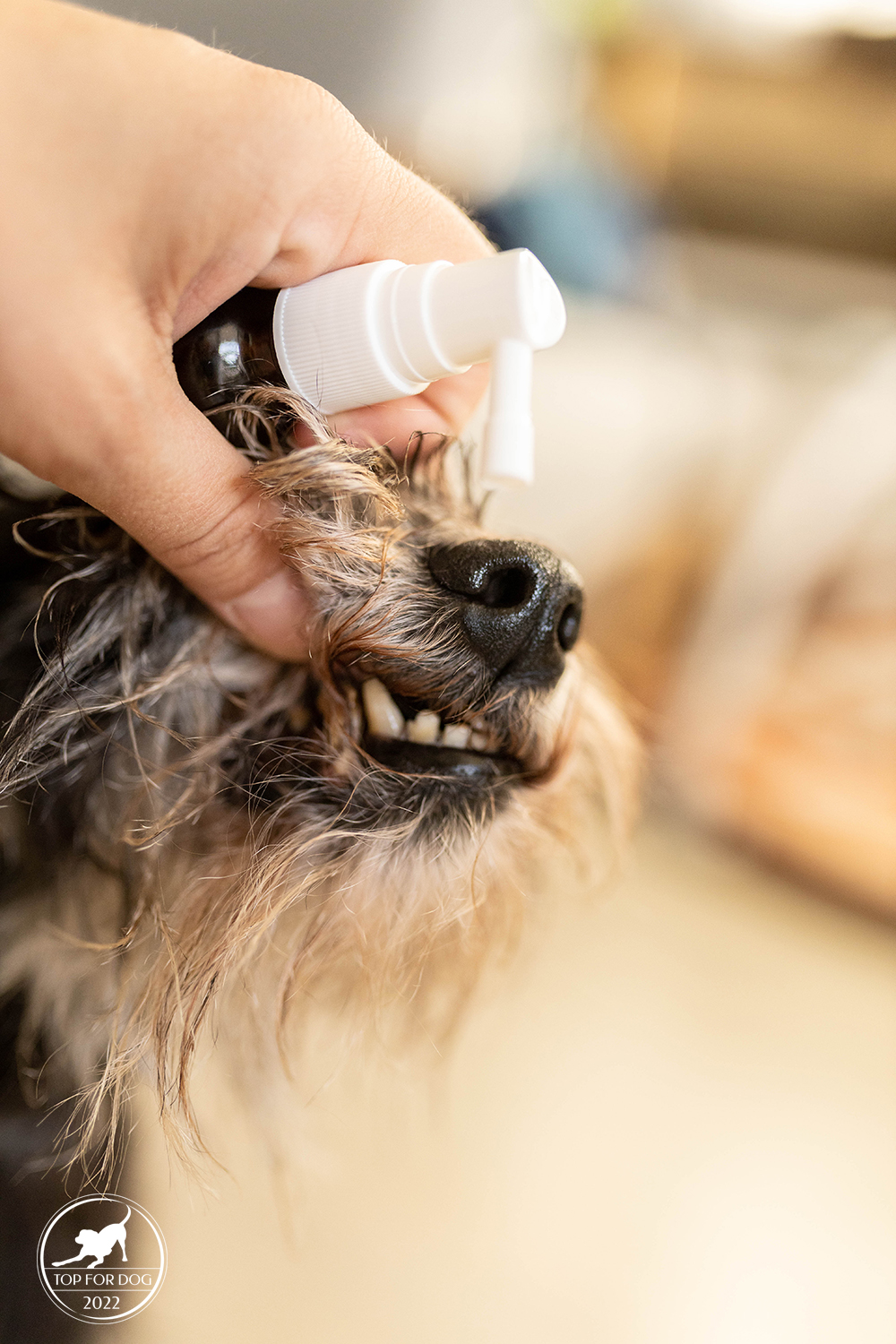 Technicznie : płyn, a dokładniej to żel znajduje się w buteleczce o pojemności 30 ml. Aplikuje się go na zęby i dziąsła psikaczem. Gęstsza konsystencja żelowa to lepsza przyczepność. Ciężko wytłumaczyć psu żeby przez chwilę się nie oblizywał i nie przełykał śliny bo lekarstwo musi zadziałać w pysku. Żel lepiej się trzyma a więc i lepiej bo dłużej działa . Miałam obawy jak Pufa zareaguje na psikacz. I nie chodzi o samo psikanie ale o smak. Nie wiem na ile jej szlacheckie podniebienie jest wyczulone , ale wiem że niektóre preparaty bardzo nie chcą wejść. Nawet jej. Tu nie było problemu. Ani się nie wzbrania przed naszym codziennym rytualnym psiknięciem ani nie ma traumy z tym związanej. Ba! z chęcią oblizuje dozowniczek 😛 tak to można psikać 😀