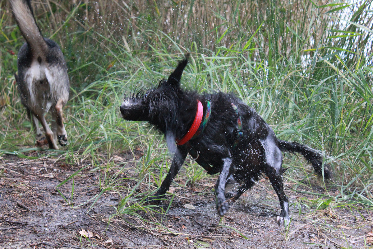 (W temacie jezior – jest woda, są psie kąpiele. Nie było chyba takiej sytuacji żeby ktoś na nas naburczał za spławianie futer. Jasne – nie pchaliśmy się w weekend na oblężoną i odzieciowaną główną plażę, ale to instynktownie wie każdy posiadacz wodnego pieseła)