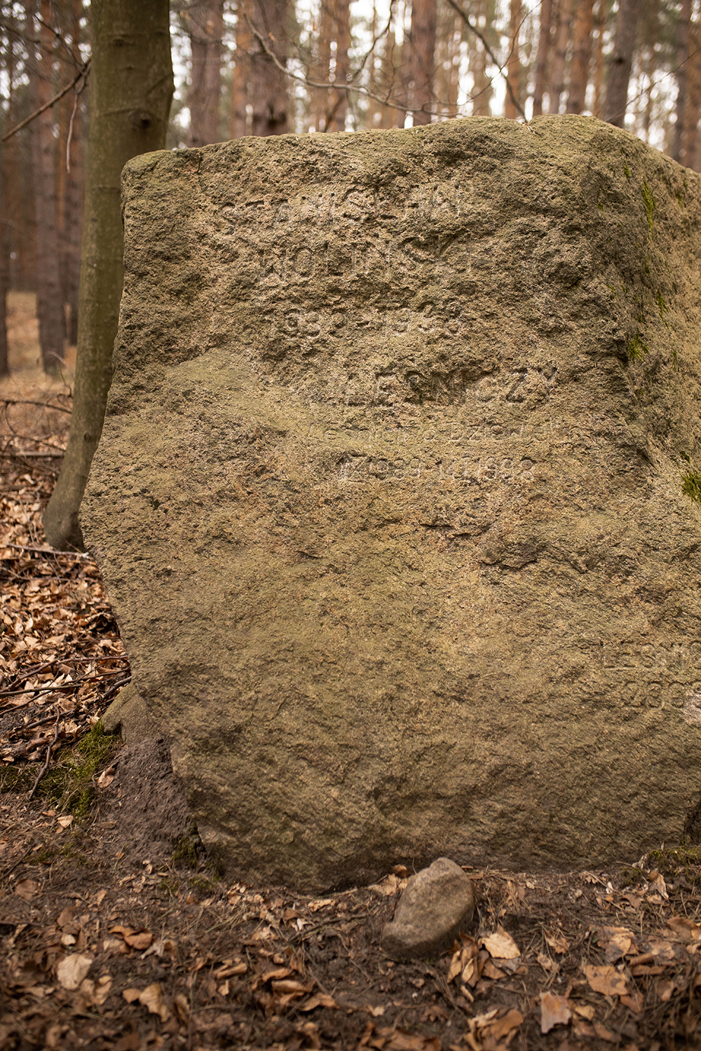 Co ciekawe, nie mogę znaleźć w czeluściach internetu żadnych informacji o samym Wolińskim. Z tego co udało się odczytać na kamieniu był to Stanisław, urodzony (chyba) w 1888 roku a zmarły w 1938. Jest też napis „leśnictwo Dziewiętlin” co się zgadza z aktualnym umiejscowieniem kamienia. Na razie nie doszłam jednak czy Pan Woliński był jakimś przyrodnikiem, naukowcem a może zasłużonym leśniczym, ale jak tylko się dowiem, bankwo Wam tu napiszę