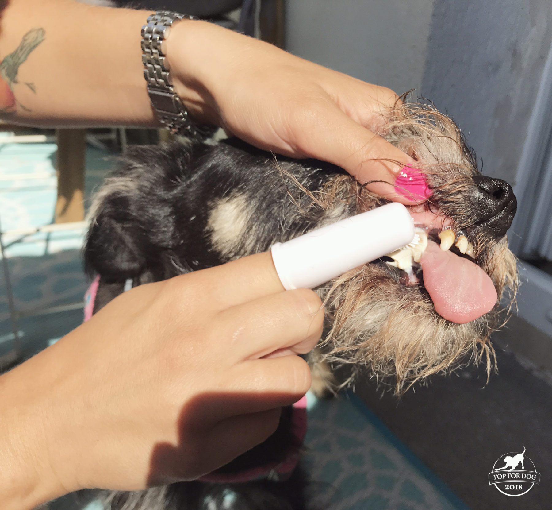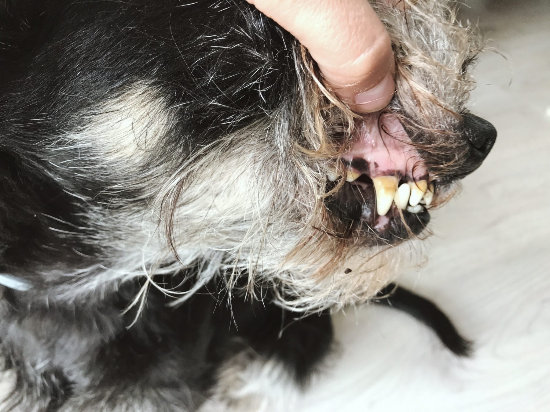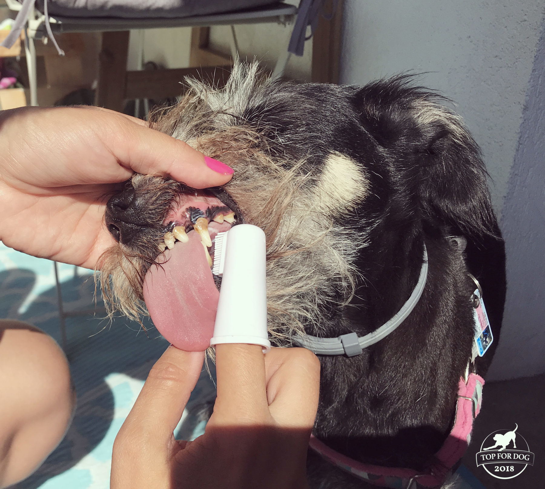 Pastę stosowałam na Pufie na razie przez ponad miesiąc. Codziennie, w ciągu dnia. Nie napotkałam wielkich oporów, mimo używania dołączonej szczoteczki. Wydaje mi się, że smak pasty przypadł hrabiance do gustu, była nawet gotowa zlizać pastę. Giga magicznych efektów nie zaobserwowałam. Uważam, że nie można się spodziewać po paście do zębów, że zrobi to samo co konkretny zabieg dentystyczny. Pufa, kiedy do mnie trafiła, miała kamień ale dużo gorszy. Nie jest to zatem wytwór choćby ostatniego roku. Po stosowaniu pasty kamień nagle nie zniknął ALE.. ale trochę się zmniejszył. Jestem kiepska w czytaniu składu, ale podejrzewam że to właśnie zasługa tych składników, które usuwają płytkę nazębną. O wiele poprawił się za to wyziew z paszczy, a to już sporo. We wspólnym życiu, w którym ja uwielbiam zalegać z psami w łóżku smrodek z paszczy może skutecznie zniszczyć idylliczną wizję 😉