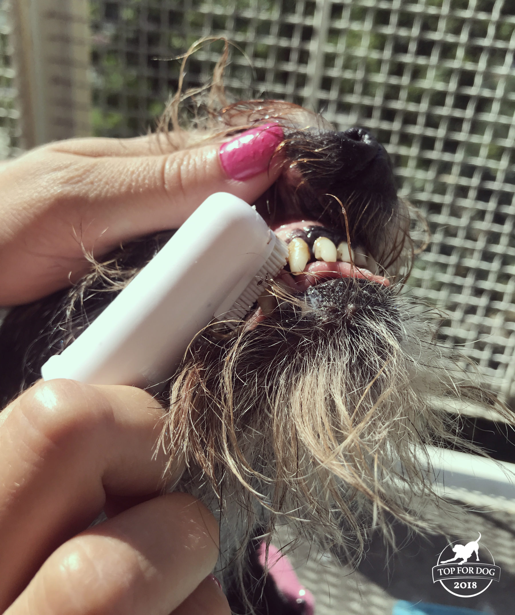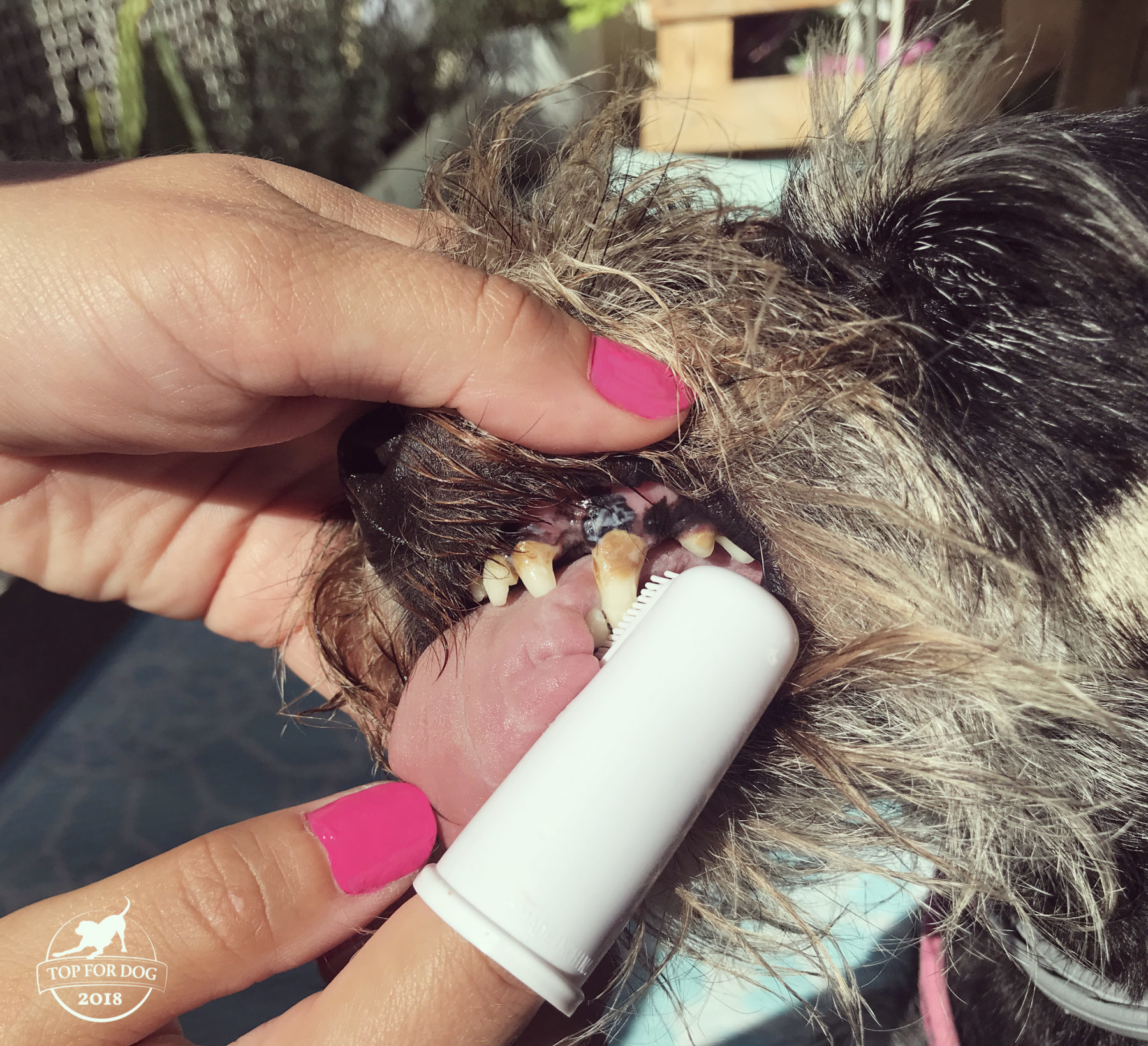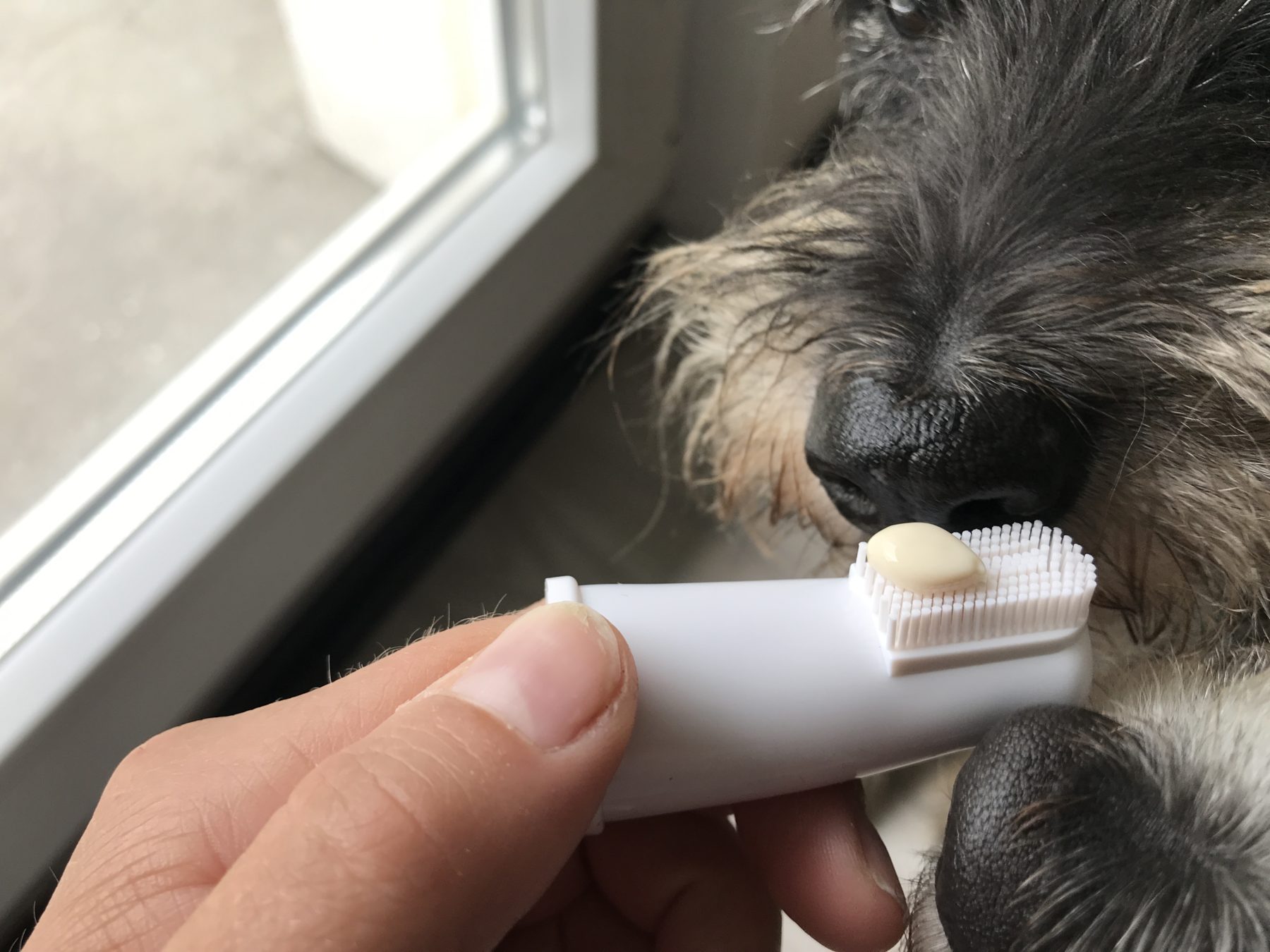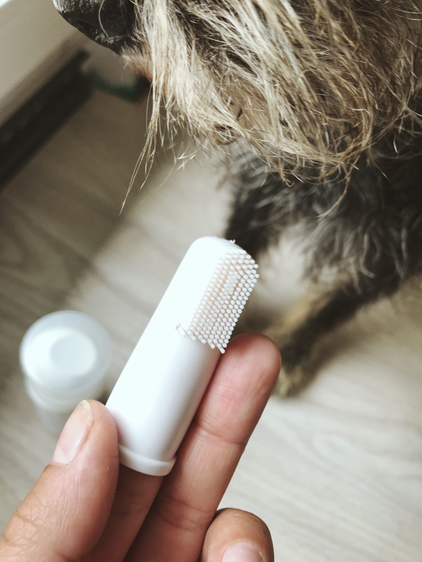 Sama pasta to nie tubka, do jakiej przywykłam w kontekście mojej higieny jamy ustnej, a buteleczka z pompką. To właśnie o pompkowej porcji mowa w dawkowaniu. Do zestawu mamy szczoteczkę, wykonaną z czegoś gumopodobnego z wypustkami, podobną trochę do naparstka, nakładaną na palec. Dzięki temu o wiele łatwiej ogarnąć psa, fafla, szczoteczkę z pastą i koncepcję szczotkowania psu zębów. Praktyczność przede wszystkim! Wypustki nie są włosiem, a ja początkowo miałam opory przed dociśnięciem tego do dziąseł – czy przypadkiem nie będzie to dla psa nieprzyjemne. W razie czego, jak radzi sam producent, można spokojnie użyć gazika czy innej psiej szczoteczki do zębów z włosiem.