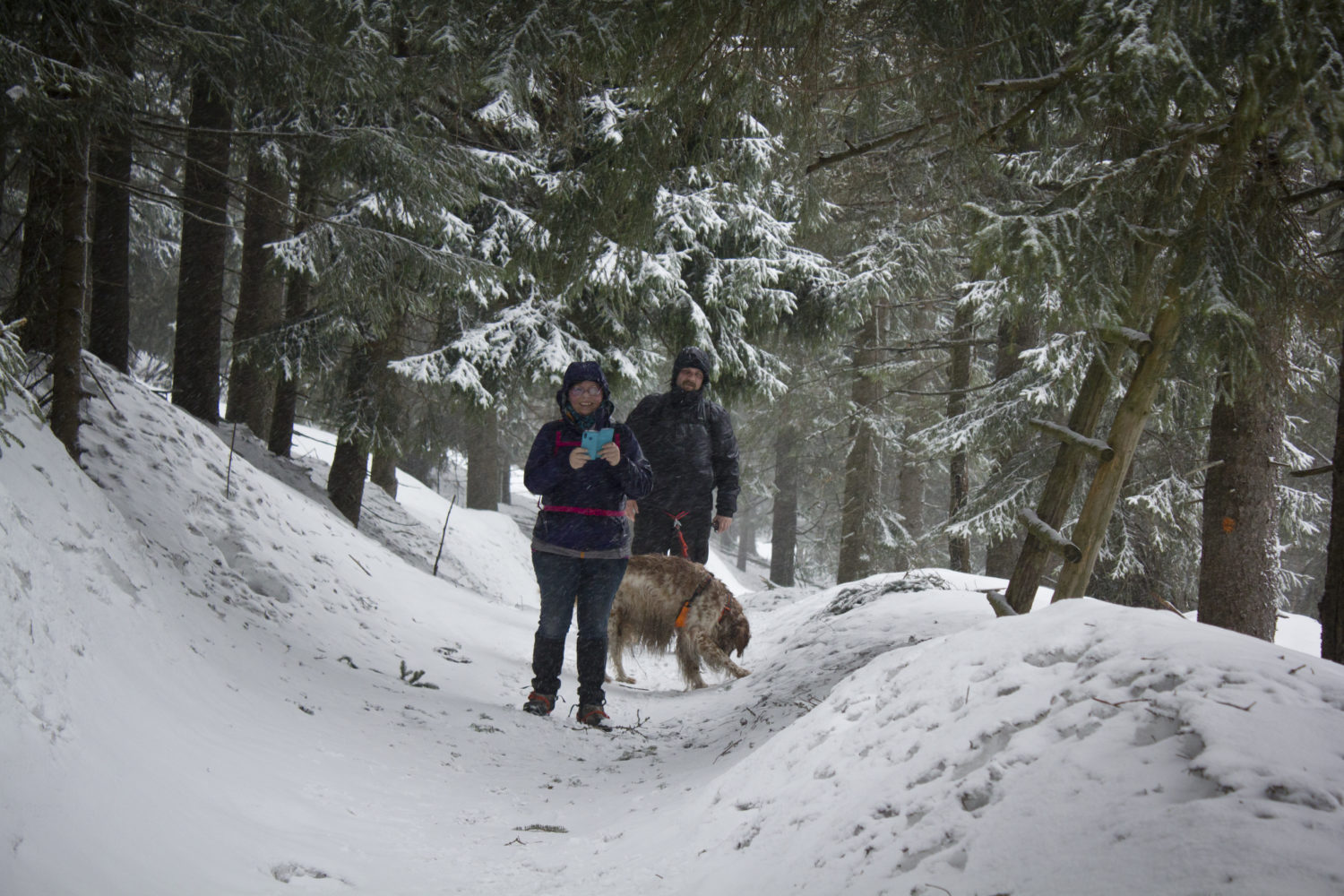To idealny przykład na to , że nawet niewielka różnica wzniesień może przenieść nas w zupełnie inny klimat. Śnieg śniegowi też nierówny. Nas spotkał ten niefajny, mokry. Myślę, że śnieg śniegowy, sypiący się z nieba nie przeszkodziłby nam w Śnieżnikowych planach. Spadałby z nas i z futer, zostałaby tylko kwestia wyrobienia się w czasie. W sytuacji jaka nas spotkała najmądrzejszym co mogliśmy zrobić to zmienić plany 🙂 Nasze bezpieczeństwo i komfort psów są najważniejsze a mokre futerka nie są wymarzoną wyprawą, nawet dla Bu 😉