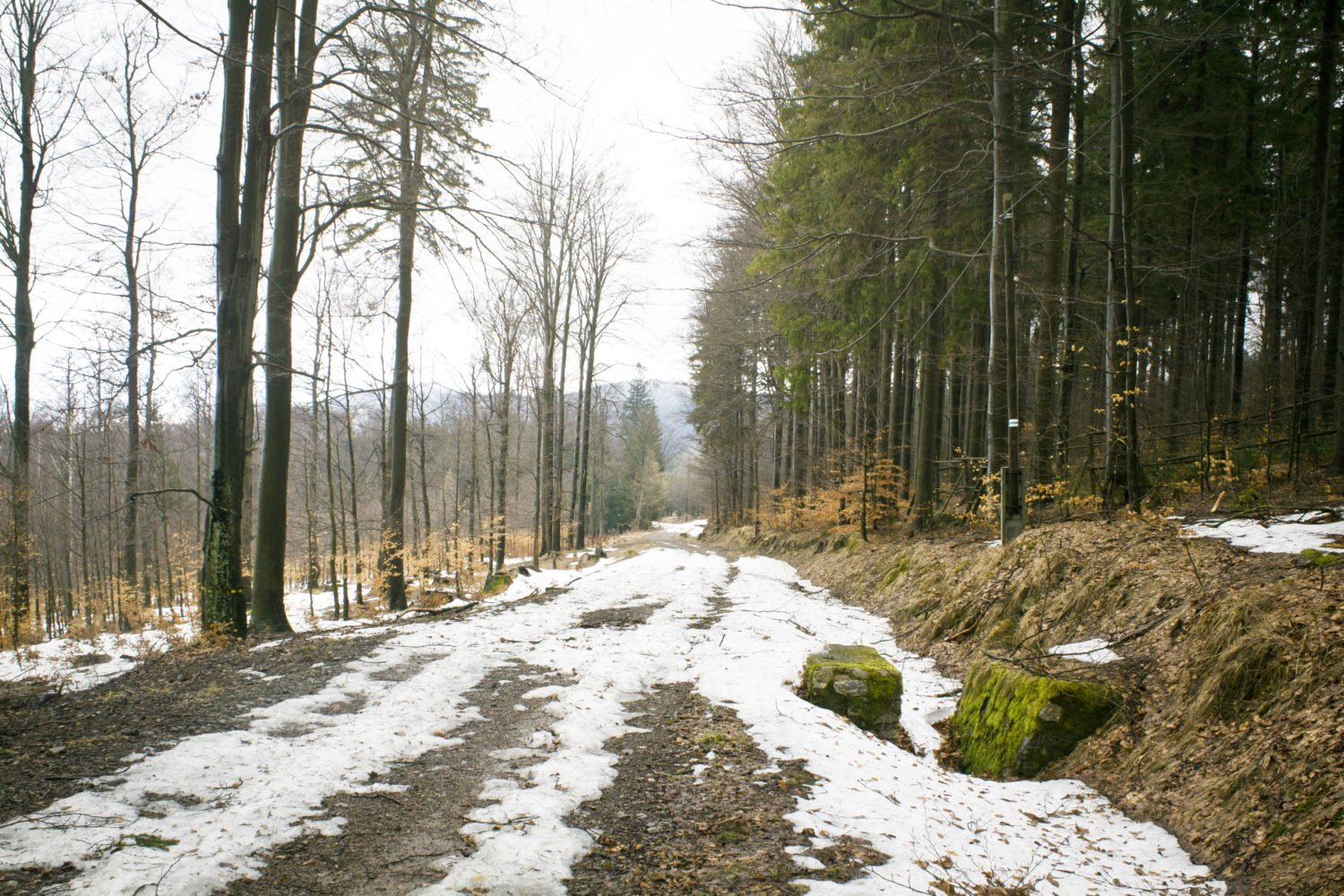 - Ominęliśmy wyznaczony kolorem szlak na rzecz „ścięcia” w kierunku Średniaka, szeroka droga, zapewne latem jeszcze lepiej widoczna, ale teraz trzeba się dobrze posiłkować mapą. Ja jestem cwaniara bo mnie tędy poprowadzono. * naszej ścieżki nie było nawet na mapy.cz a to już niezły wyczyn 😉