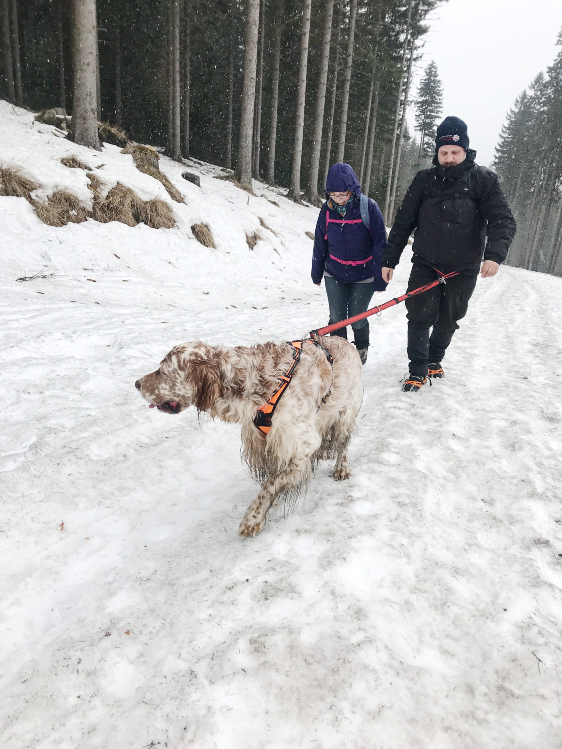 Dopiero po jakimś czasie zaczyna się zabawa. Najpierw zaczyna padać. Po dalszym podejściu deszczyk zmienia się w śnieżek. Na koniec wspinamy się w strefę mokrego śniegu, oblepiającego nas i psy. Nie jest to wymarzona pogoda na wędrówkę po górach. Raczki też okazują się bardzo pomocne.