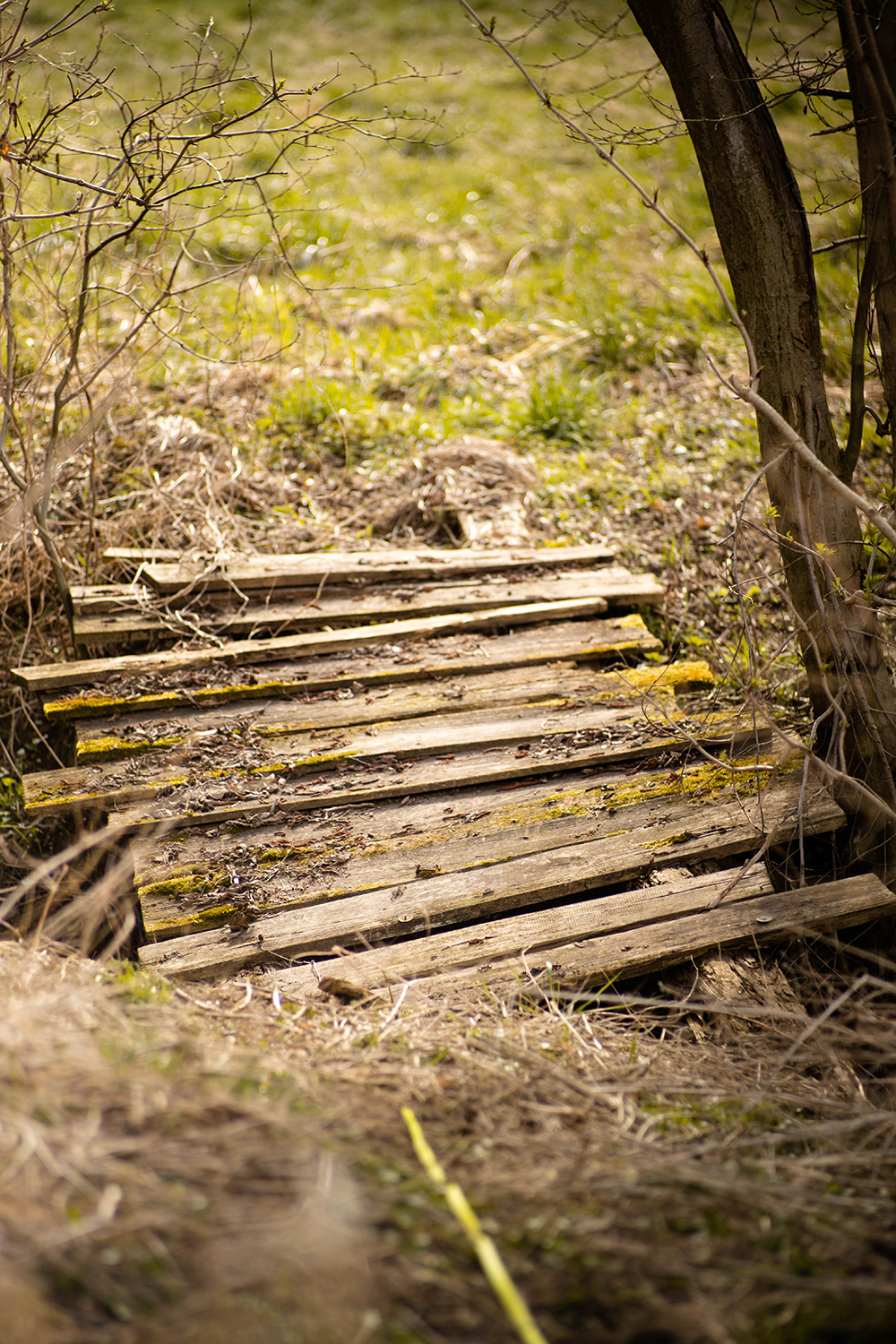 Leniwa rzeczka snuje się w dość głębokim korycie, nawet przy niskim stanie wody nie uśmiechało mi się przeskakiwanie jej na dziko. Teoretycznie na mapach cz widoczne jest przejście na drugą stronę. Potwierdzam, jest, choć o bliżej zabudowań Taczowa Małego, niż można by wnioskować z mapy. Przejście to na oko podpróchniały mostek . Przechodziłyśmy z suczydlami pojedynczo. Miałam drobne obawy że dodatek do mojej masy w ilości psich 8 kilo okaże się decydujący 😛 to pewnie tylko moje małe fobie, ale jednak przygód typu ratowanie aparatu przed zamoczeniem, wolałabym nie doświadczać 🙂