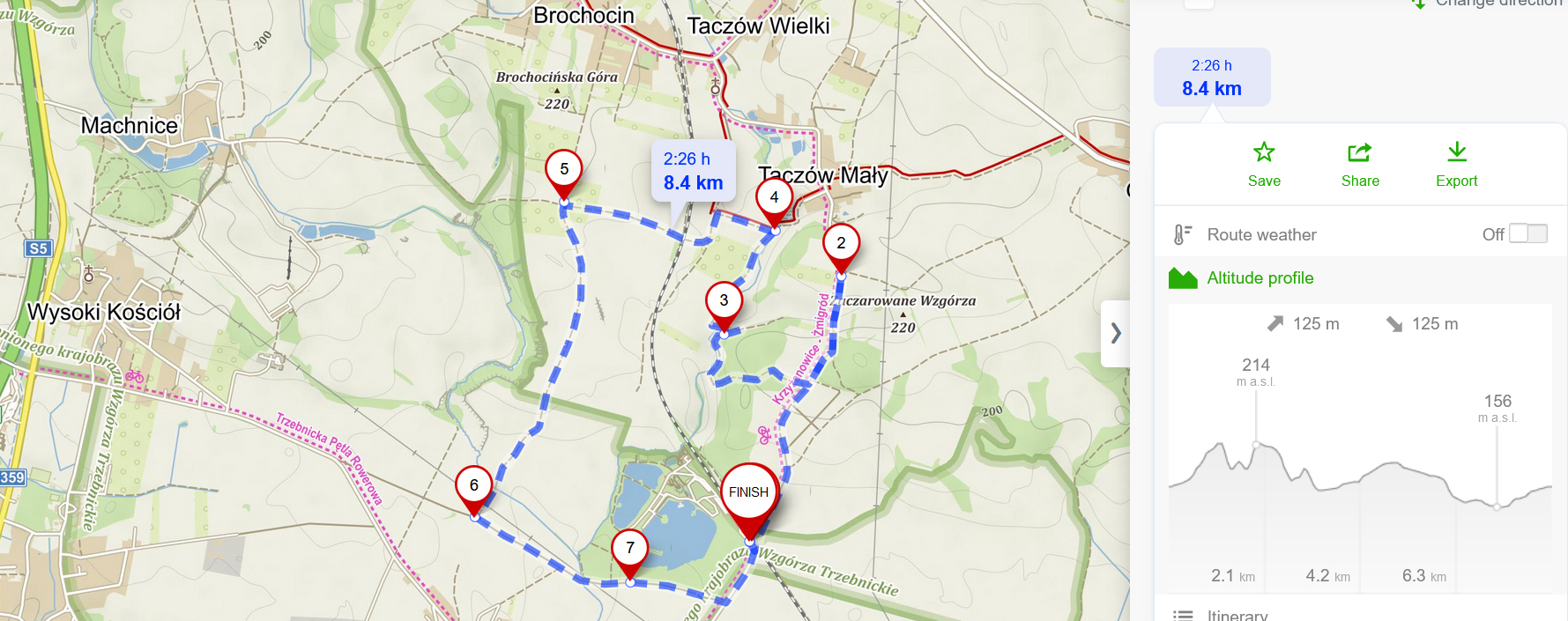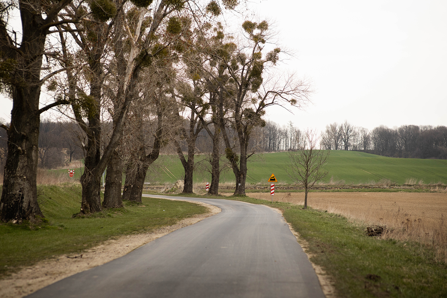 Na tym etapie skończyły się dla nas dzikie przeprawy, dalsza wędrówka to szerokie, utwardzone dukty, prowadzące tak, żeby pokazać trochę pofalowane tereny tej okolicy. Nawigacja, mimo, że tylko przez chwilę idziemy szlakiem czerwonym, to czysta przyjemność. Ciężko się zgubić nawet tylko od czasu do czasu zerkając na mapę. To taka trasa na bezstresowe wędrowanie. Można robić zdjęcia, można pobujać w myślach i się nie zapodziać pośród ścieżek