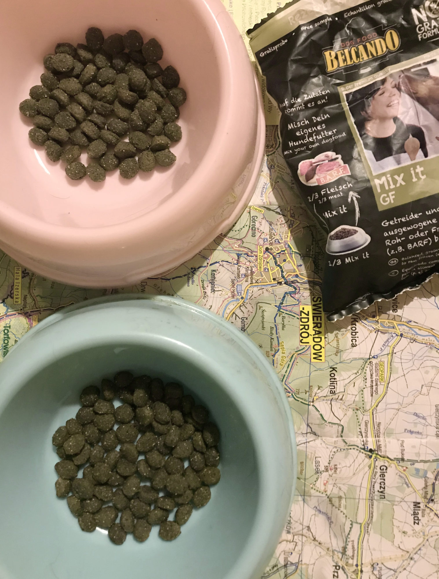 Pozostaje pytanie co z suplami, które są nieodzowne przy BARFie. Ano Belcando zadbało też o to. Do kompletu z Single Protein możemy zaopatrzyć się w kulkowy dodatek do BARF – Mix IT GF. To po prostu skondensowany strzał mikroelementów, minerałów, witamin itd., podany w postaci małych kulek-chrupek. Dla mnie to fajna sprawa, porcję dzienną mogę spokojnie wykorzystać na trening, suczydła kulki wciągały nosem 😉 Można toto dodawać zarówno jako uzupełnienie do puszek jak i mięsa. Podoba mi się taka opcja, odchodzi mi zabawa w przewóz supli np na urlop. Ja osobiście na co dzień wolę moje klasyczne suple, przyzwyczaiłam się do rytuału namaczania krwi i usypywania psom na kolację suplozupy, ale jako wyjazdowe rozwiązanie – jestem bardzo ZA! Poza tym chrupale w saszete i heja na zdjęcia (wiecie – pufostado za darmo nie pozuje 😉 )